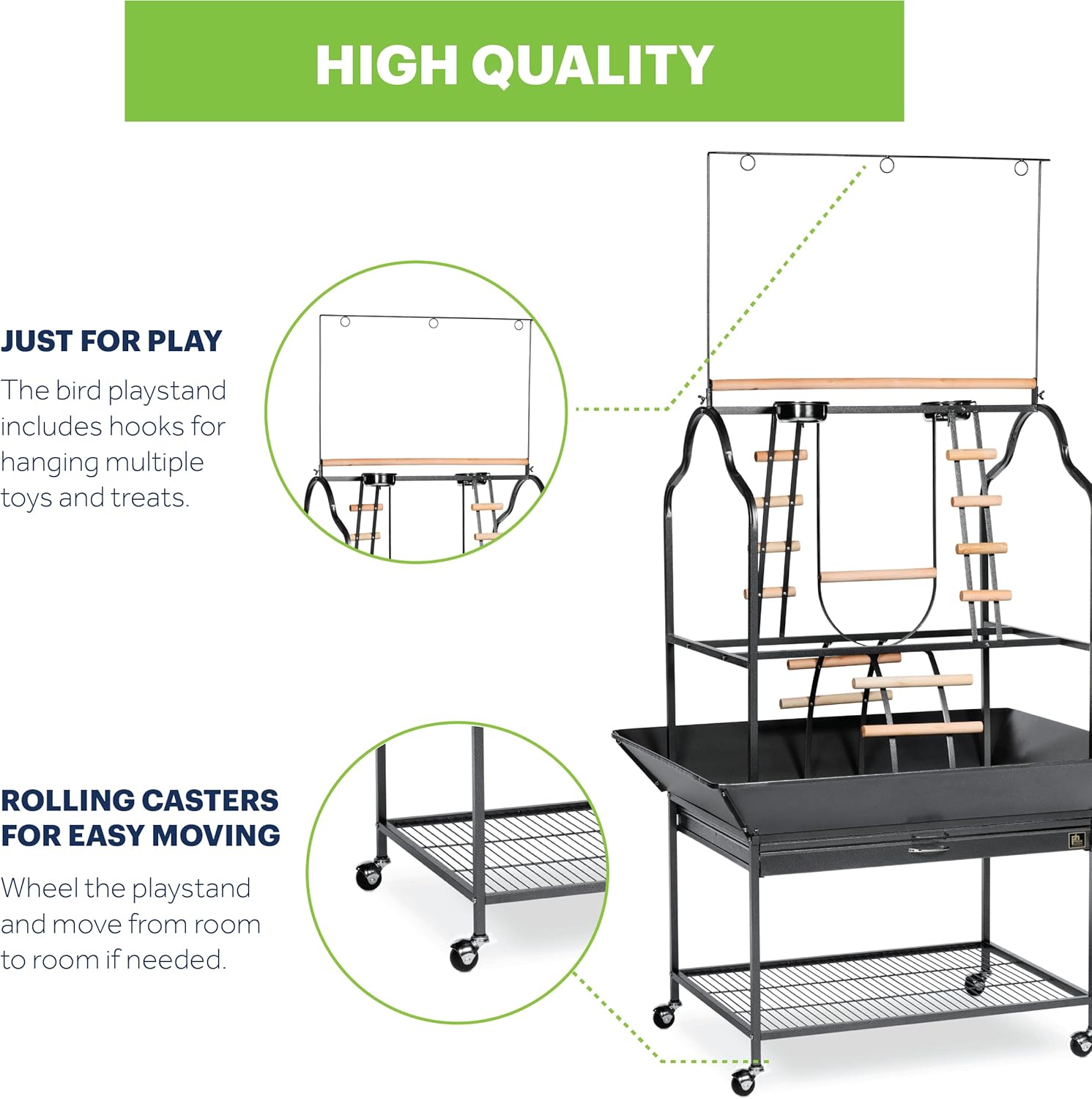 - High-Quality: The easy-rolling caster wheels let you easily move the play stand from room to room or indoors to outdoors. Plus, the durable and well-built playstand features accessories like double cups for food, water, or treats.