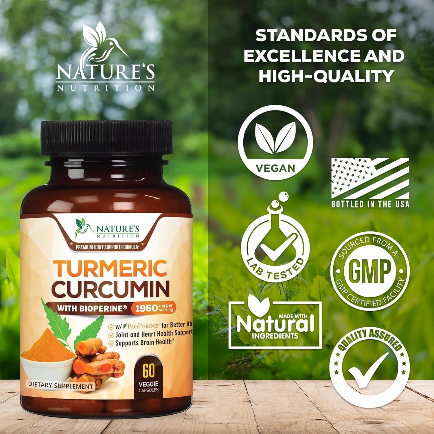 Turmeric Curcumin Supplement 1950mg - 95% Curcuminoids with Organic Turmeric & BioPerine Black Pepper Extract for Best Absorption, Nature's Vegan Joint Support, Non-GMO, Bottled in USA - 60 Capsules