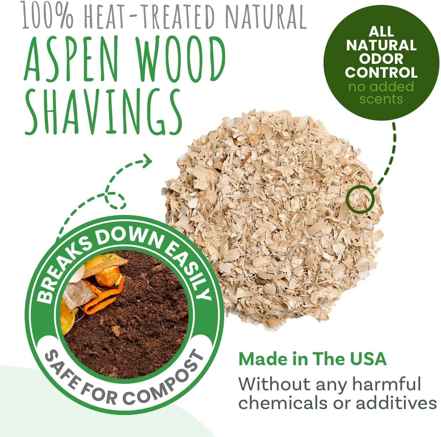 - 100% Heat-Dried All Natural Aspen Shavings: Made in the USA without any harmful dyes, chemicals or additives; Made from wood shavings directly off the tree - so no potentially dangerous fibers that may cause respiratory problems or other health issues; Breaks down easily and organically for safe disposal in your garden, compost, or organic waste bin