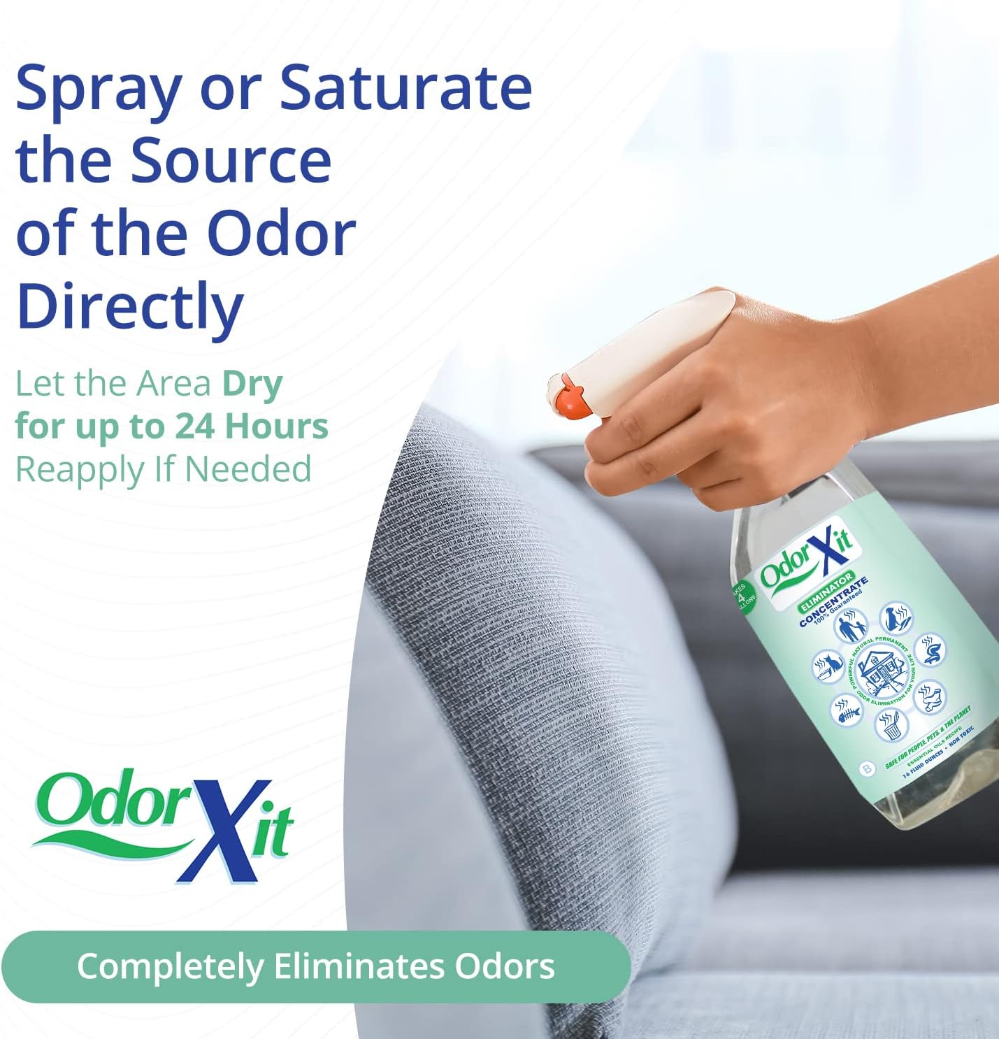 - Eliminate Tough Odors: OdorXit Odor Eliminator works to effectively remove strong odors at the source; Effectively removes odors of pet or human pee and poo, vomit, skunk spray, decay, spoiled food, fish, and more; Great for those with incontinence