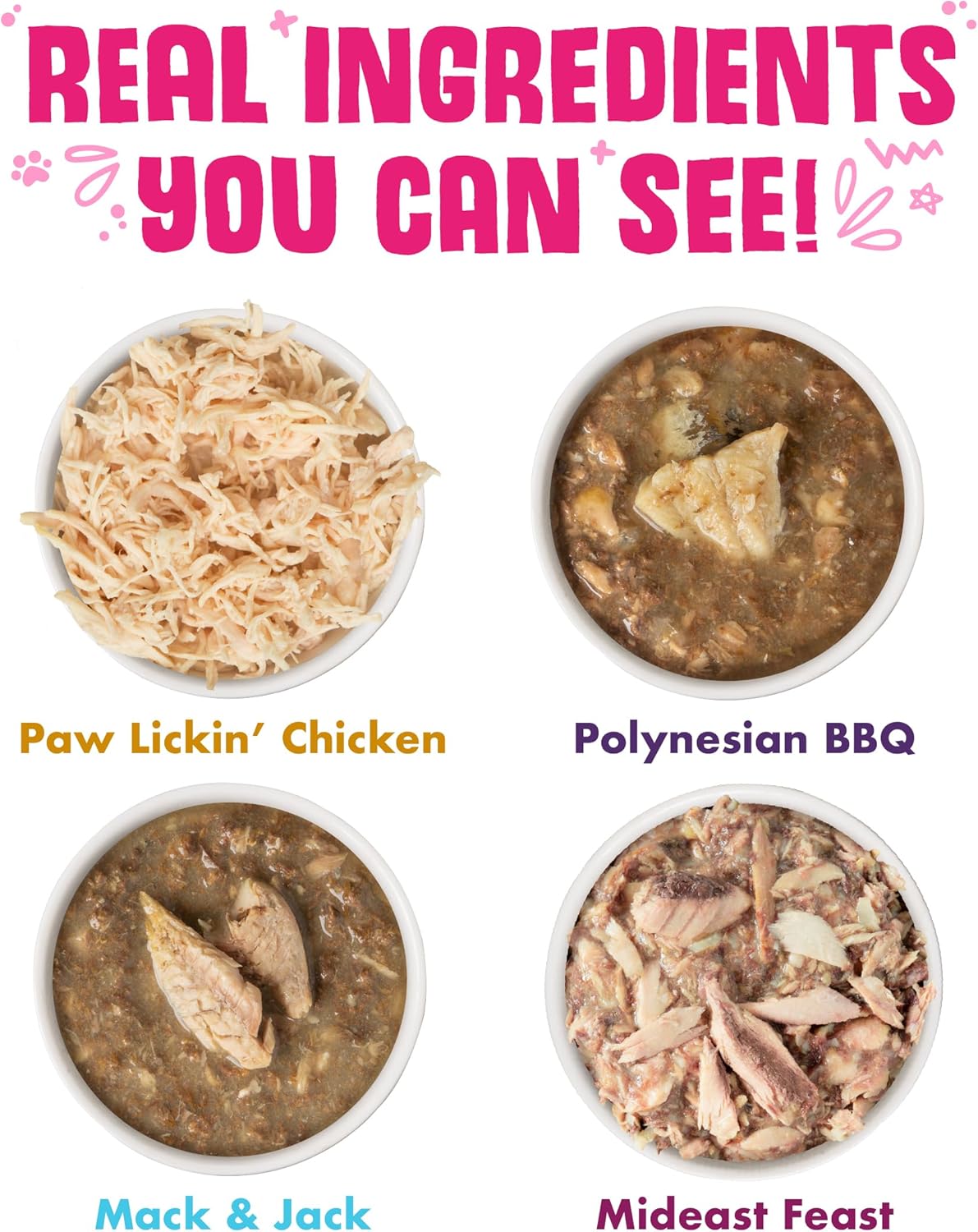 - Variety Pack includes 3 cans of each: Paw Lickin’ Chicken, Mideast Feast, Mack & Jack & Polynesian BBQ
