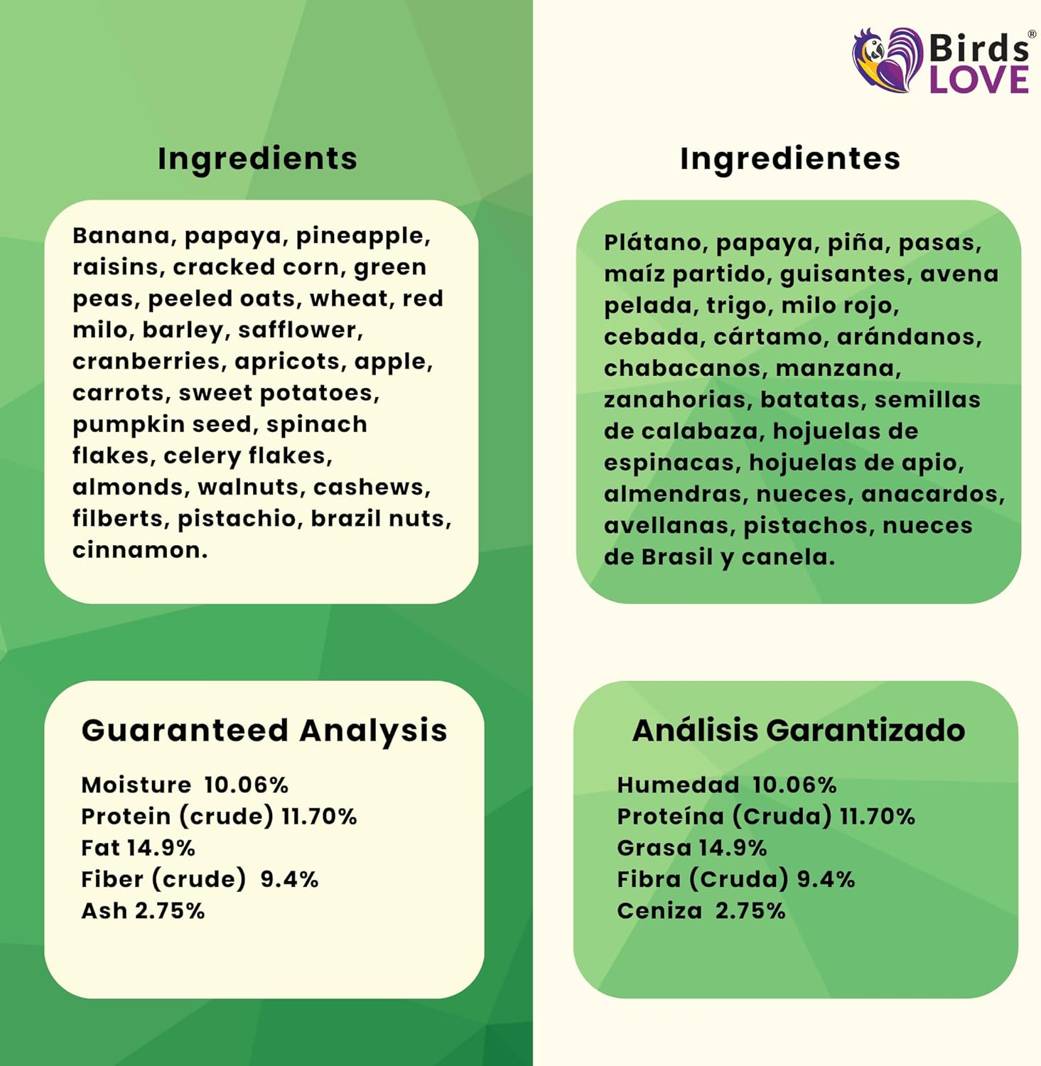 - No added preservatives nor sweeteners: natural sweet fruits to maintain healthy skin, muscles, and feathers