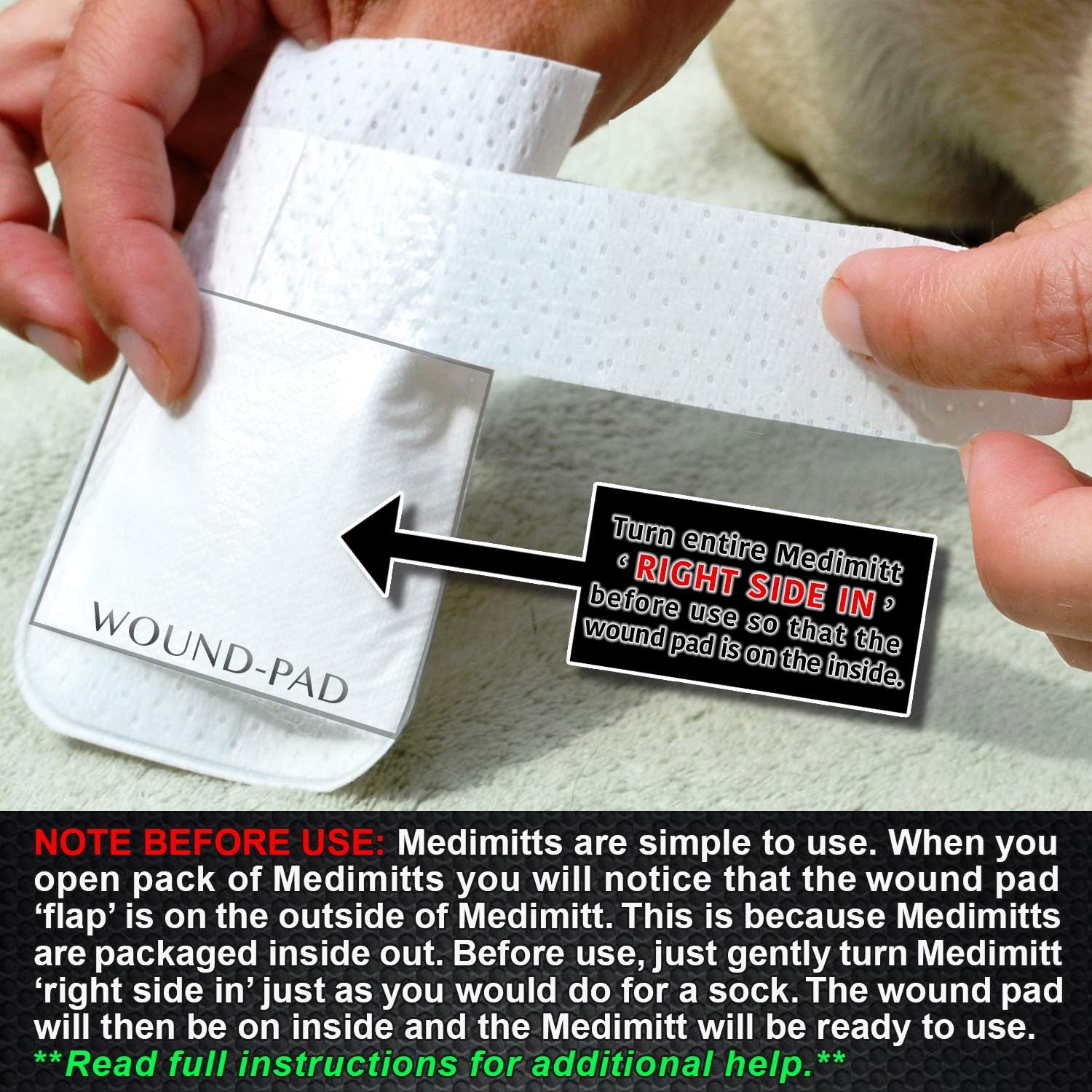 - SPECIAL NOTE FOR USE: PawFlex Medimitt paw Bandages are packaged inside out. For use, gently turn right side in so that the attached wound pad is on the inside. Direct the paw into the Medimitt and wrap non- slip Hook & Loop ADJUSTABLE STRAP fastening strap around pets’ wrist. Never wrap fastening strap too tight. The Medimitt will stay on with gently stretch.