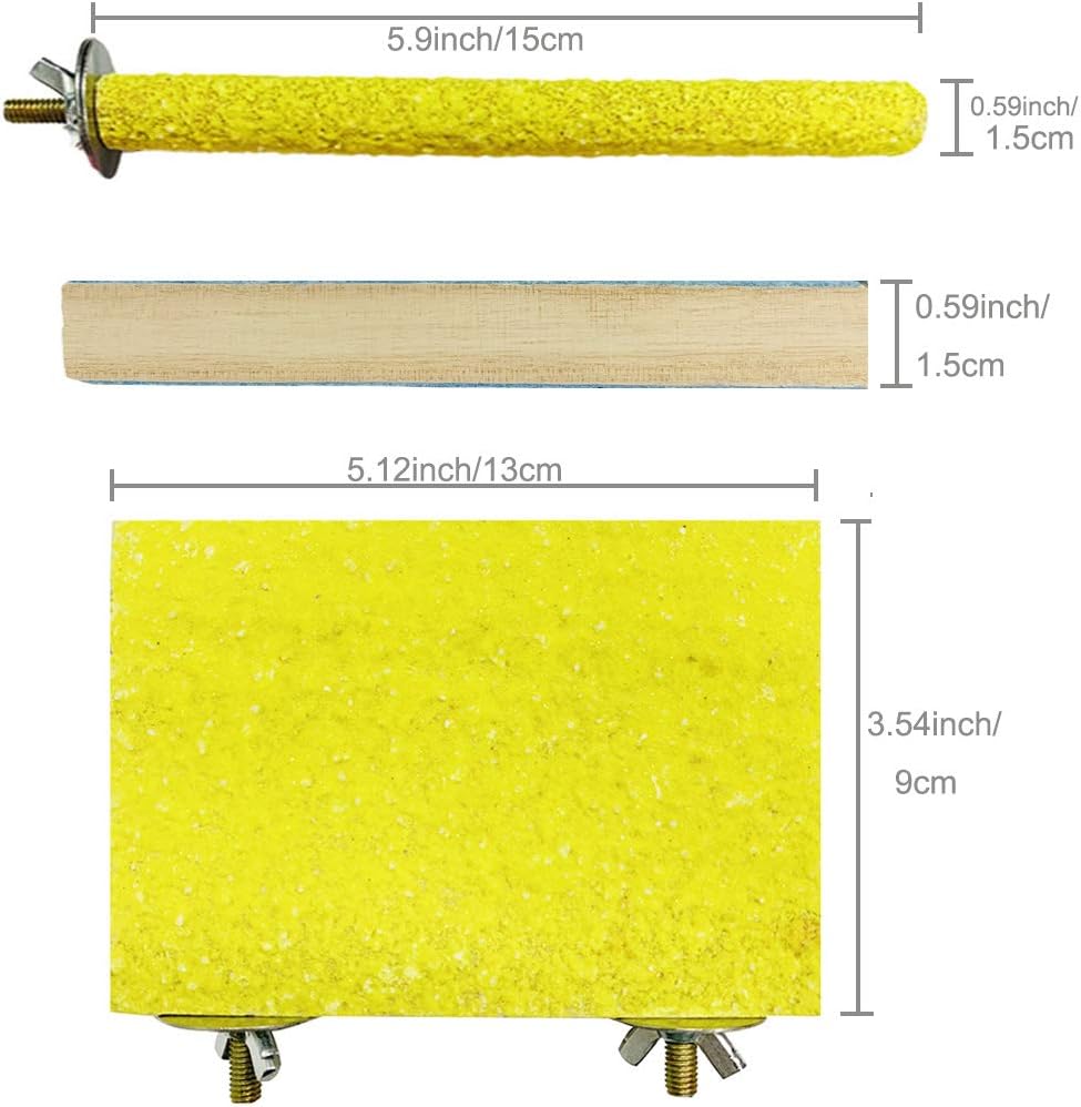 - 6 PACK BIRD PERCH STAND TOY : Perfect bird cage accessories toys to decorate your birds cage. You can get 6 parrot perch toys with one purchase.The parrot perch stand platform is 5.12*3.54*0.59 inch and two types of boards allow your pet to choose freely. The length of the paw grinding stick is 5.9 inch and the diameter is 0.59 inch