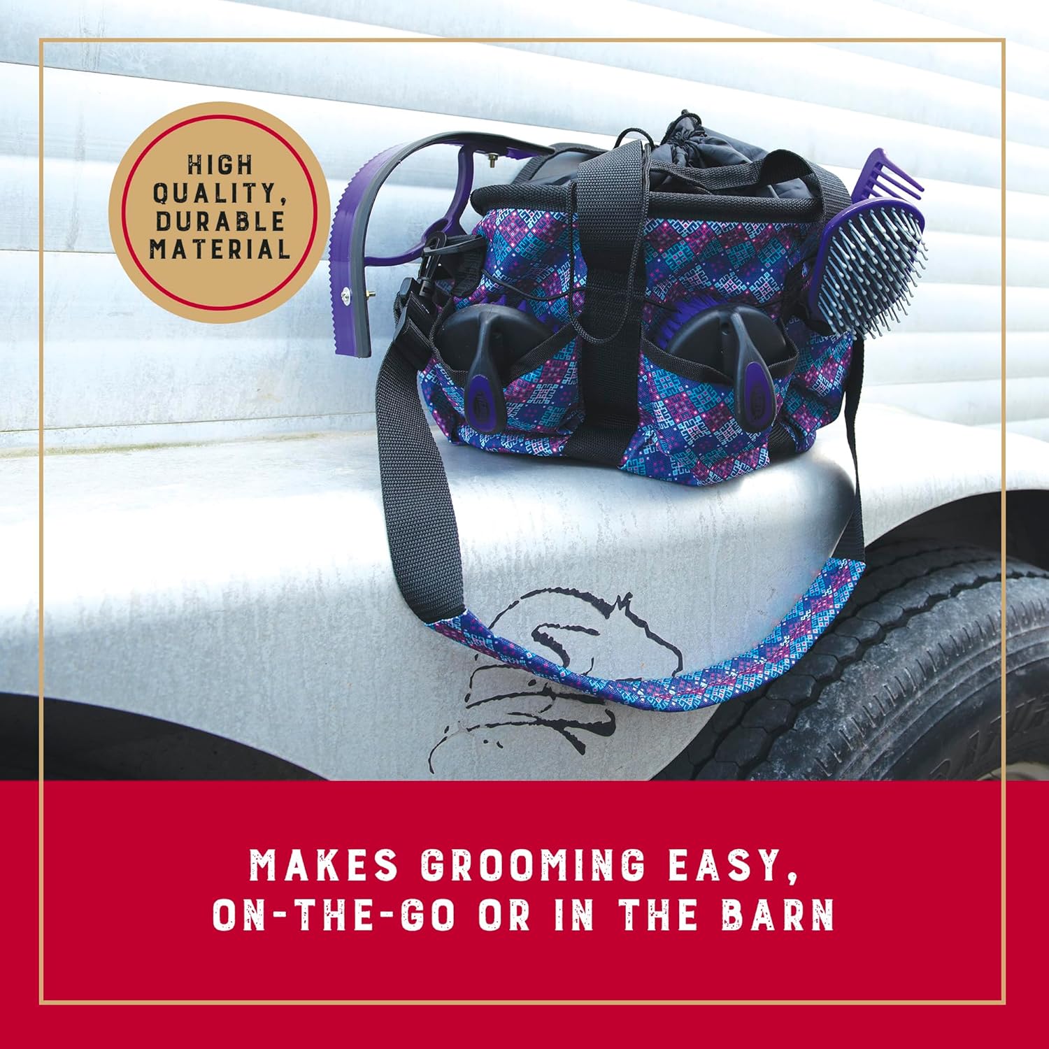 - Comfortable and Portable: Designed for easy use, the adjustable grooming bag for horses includes comfortable webbing handles and soft padded shoulder strap with on and off snap; effortlessly carry this lightweight equine grooming kit wherever you go
