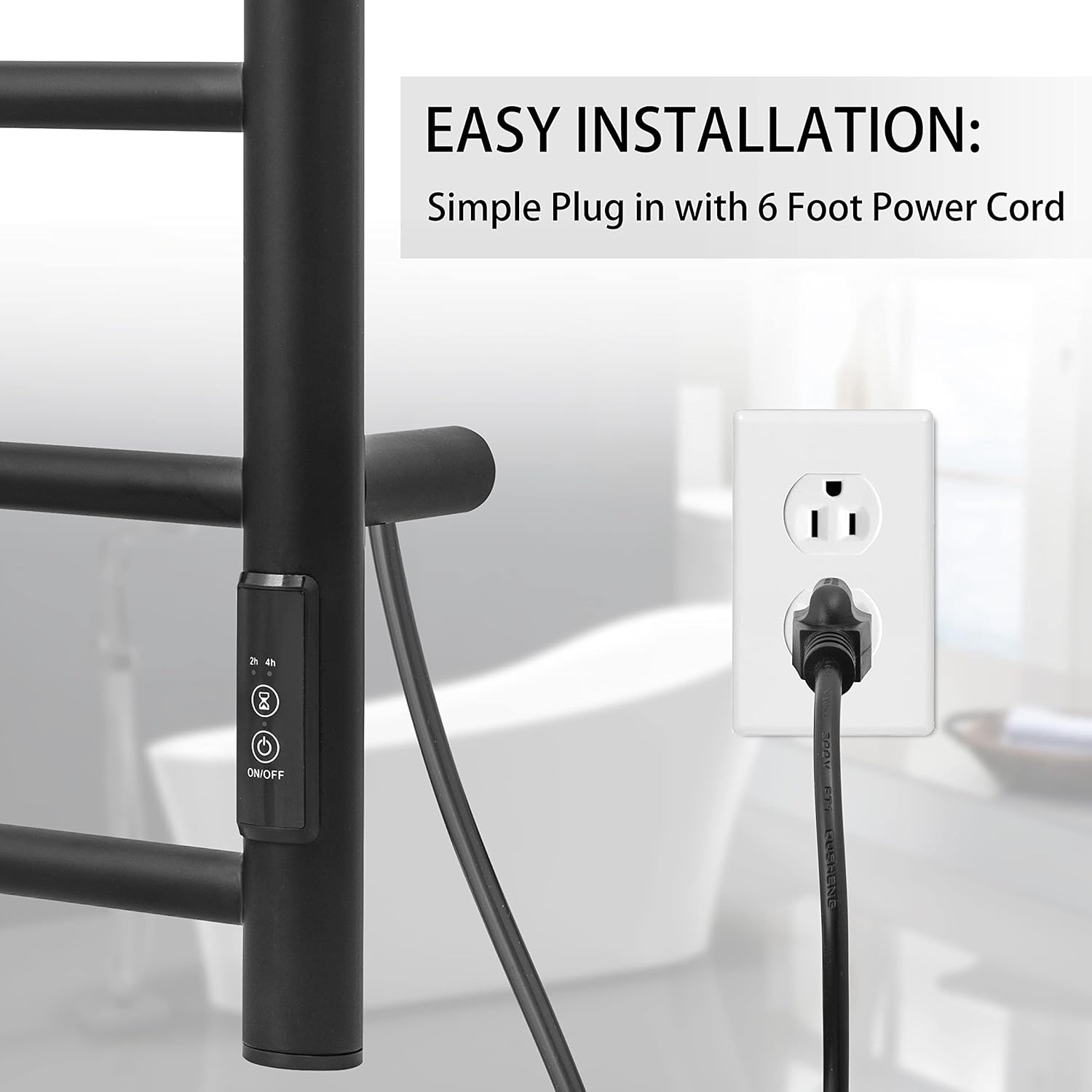KEG Towel Warmer Wall Mounted with Built-in Timer 4 Bars Electric Stainless Steel Heated Towel Racks for Bathroom, Hot Plug-in Bath Towel Heater Matte Black