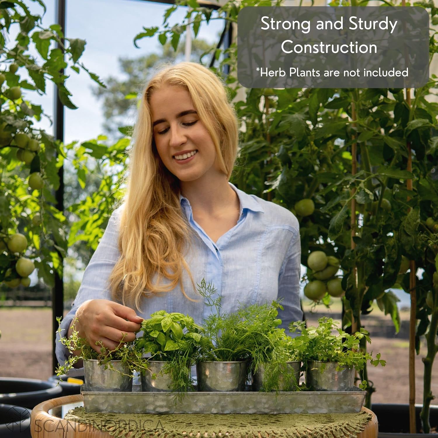SCANDINORDICA Galvanized Metal Herb Planter, 5 Pots with Drainage Holes, Indoor Outdoor Use, Farmhouse Decor, 19.5x3.9x3.5 inches