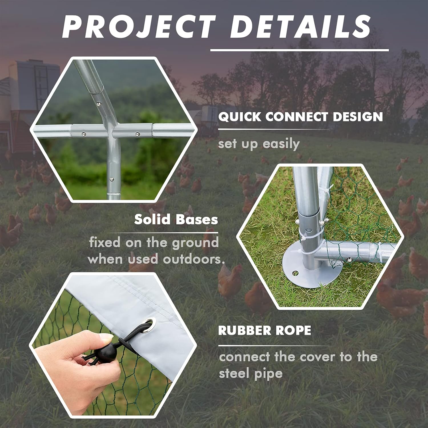 - Durable Steel Chicken run house: The chicken coop uses a durable steel pipe frame, coupled with galvanizing technology, don't worry about rusting in outdoor. The steel pipe diameter reaches 0.98 inches, which is strong and stable enough in windy and heavy rain