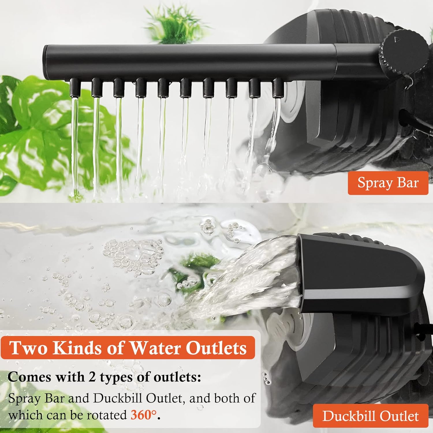 • 【Two Types of Water Outlets】The fish tank internal filter has two types of outlets: Spray Bar and Duckbill Outlet, and both of which can be rotated 360°. There is an adjustable knob in the spray bar, which can adjust the water flow of the filter, and the adjustment range is 0-165GPH.