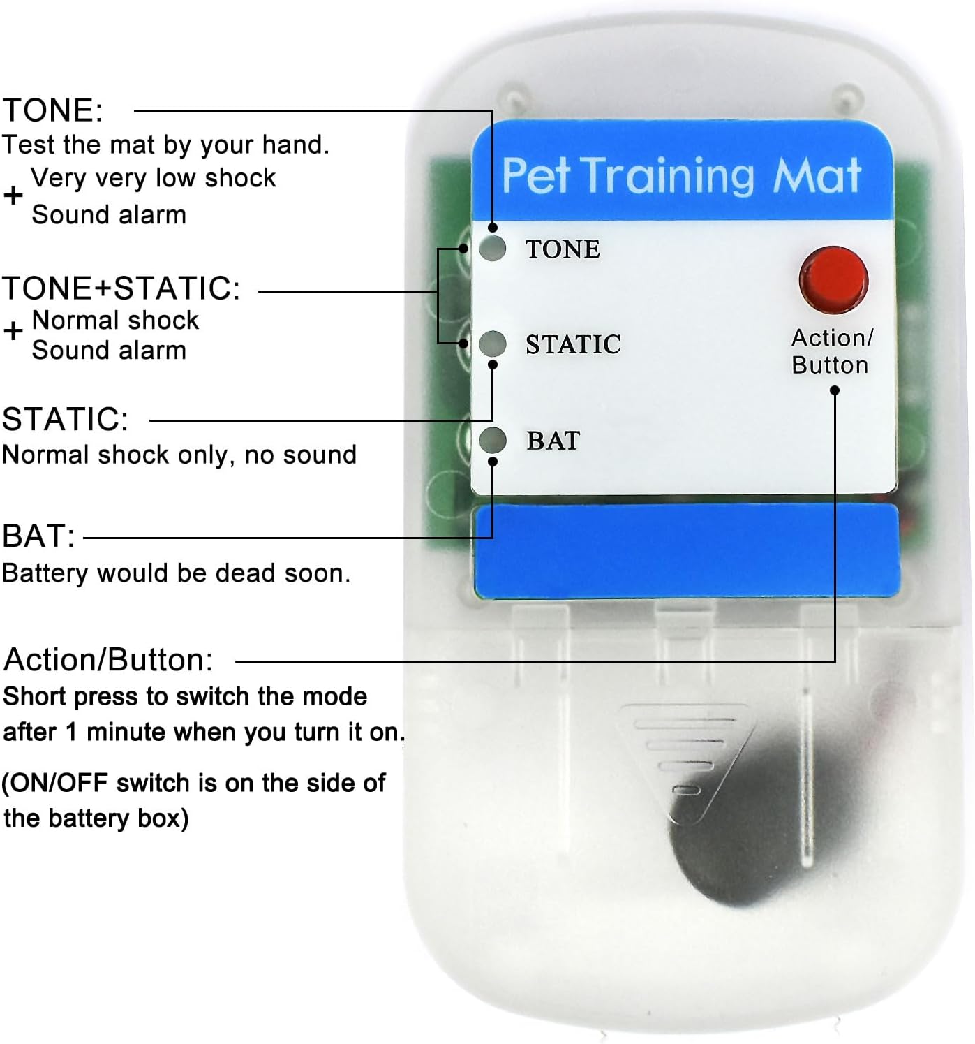 - Three working modes (TONE, TONE+STATIC, STATIC) on the training mat, suitable for most size dogs and cats