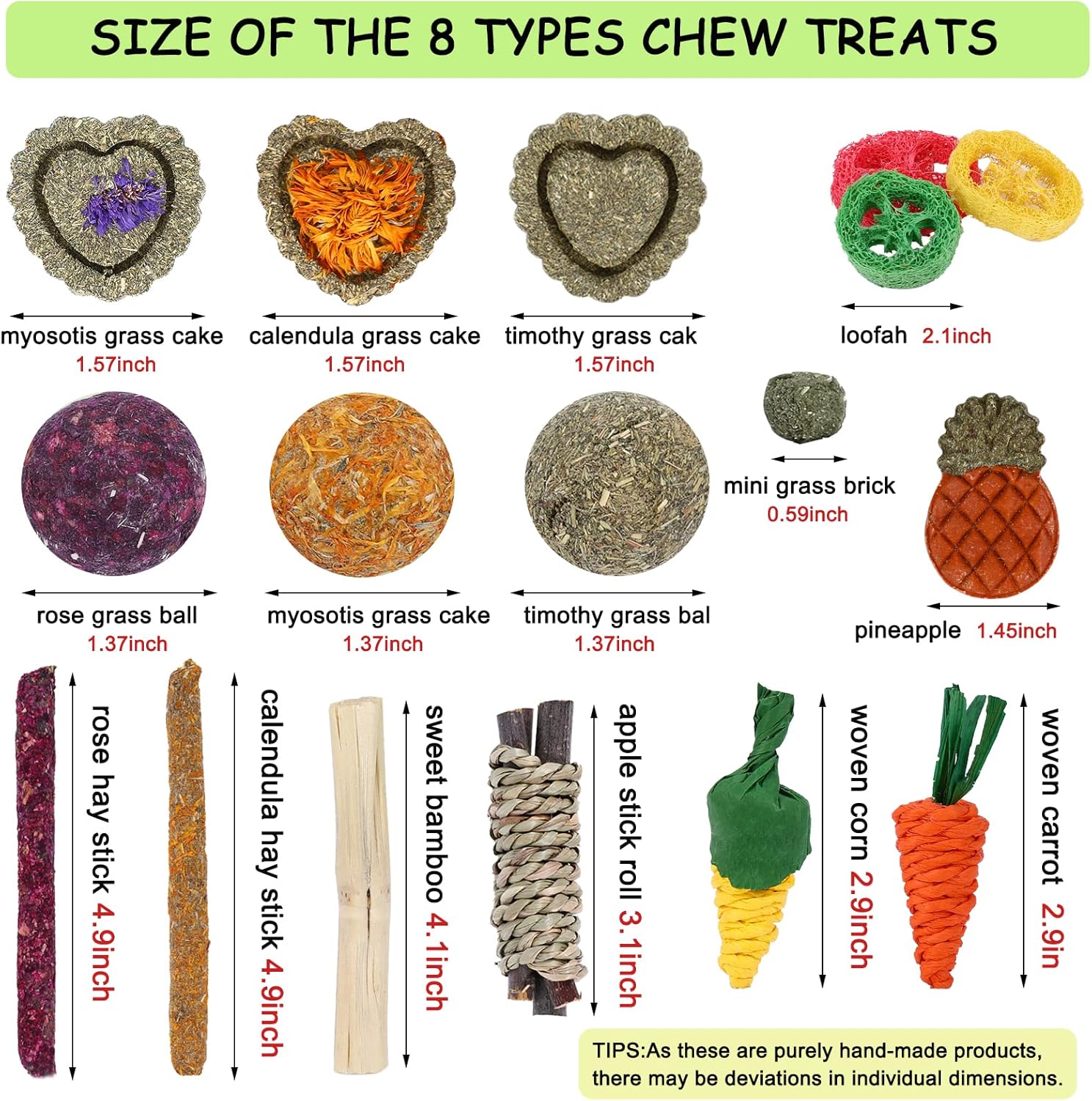 - 【SUPER VALUE PACK】 our rabbit toys set includes pineapple chew toy×1:timothy grass cake×1; calendula grass cake×1 ; myosotis grass cake ×1; timothy grass ball×1; calendula grass ball×1 ; rose grass ball ×1; calendula hay stick ×1;rose hay stick×1; woven carrot×1 ; apple stick roll×1 sweet bamboos×2; woven corn×1; mini grass bricks×4 ; loofah toys×3, enough quantity for your little pet to play and chew.