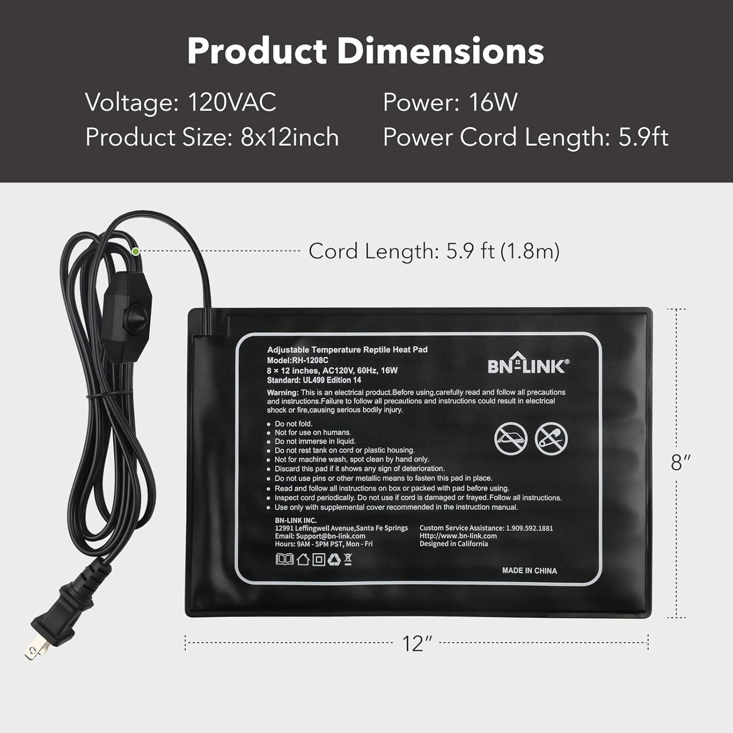 - MADE FOR REPTILES: Voltage: 120 volt, Power: 16 watt. The 8" x 12" model is perfect for a 10 -20 gallon terrarium and it can easily put out steady heat between 104β and 122β. Each unit comes with BN-LINKβs strong 15-month warranty.