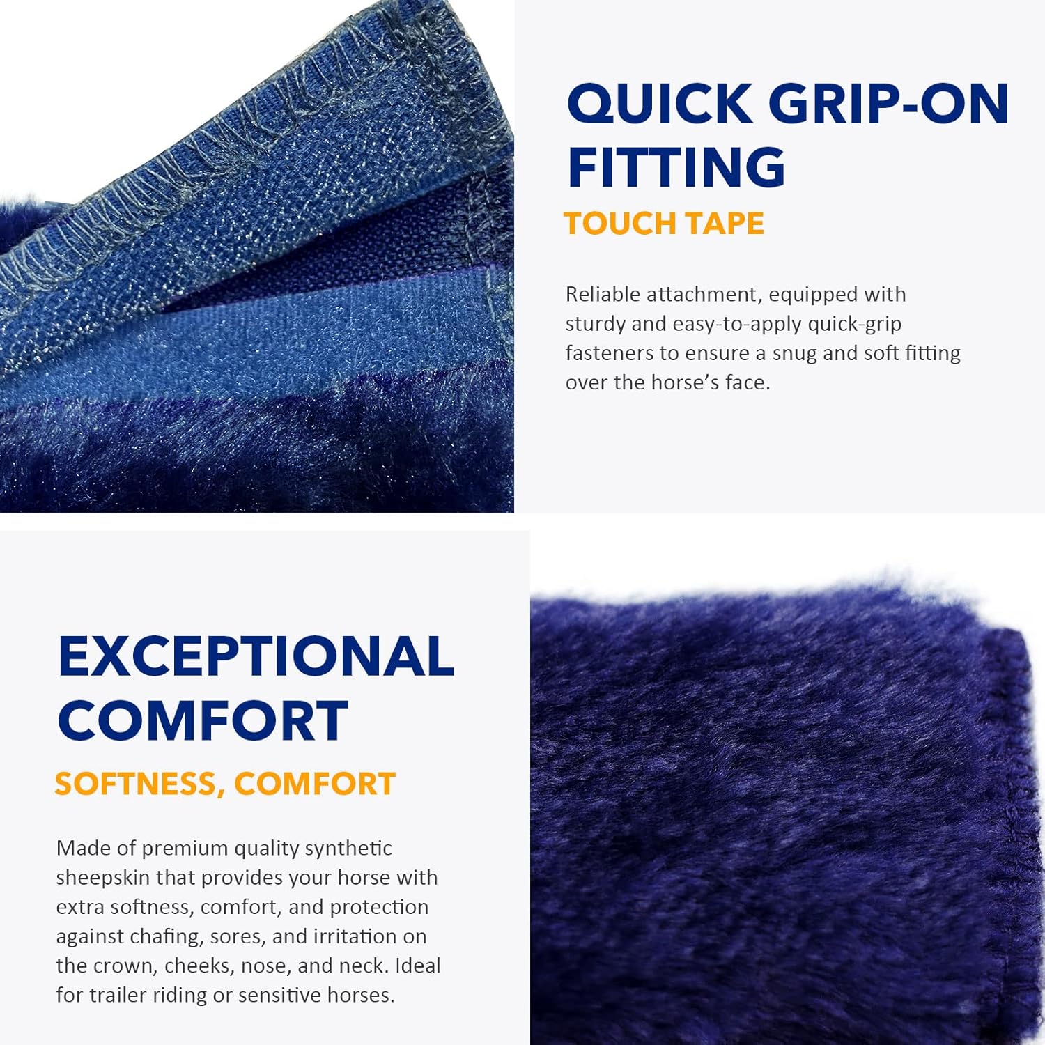 - EXCEPTIONAL COMFORT: Made of premium quality synthetic sheepskin that provides your horse with extra softness, comfort, and protection against chafing, sores, and irritation on the crown, cheeks, nose, and neck. Ideal for trailer riding or sensitive horses.