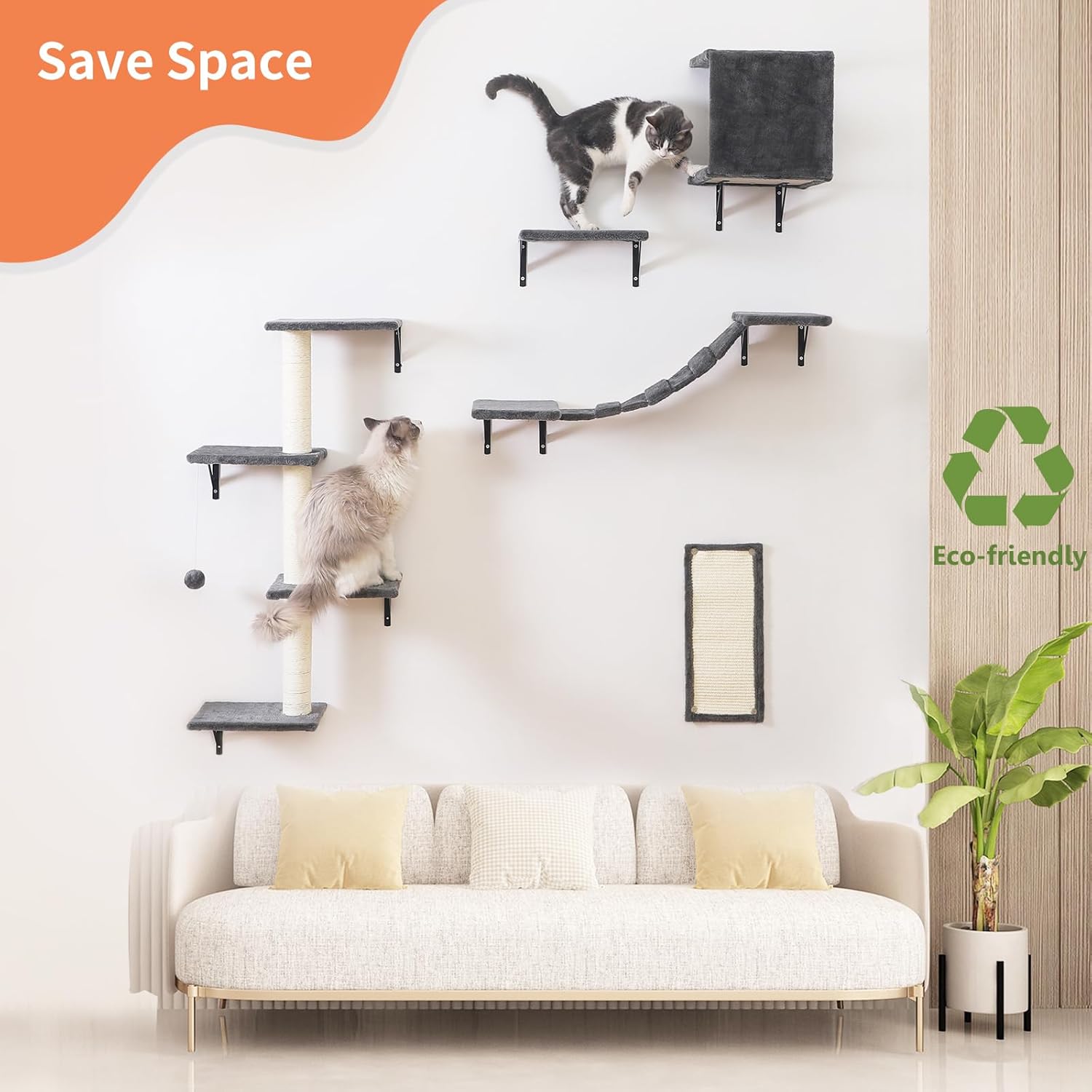 - [Deluxe Cat Wall Shelves] This 5pcs cat wall climber set includes a plush cat bridge & steps, a scratcher, and a cat tree with sisal rope. Come on and build cat walkways on walls