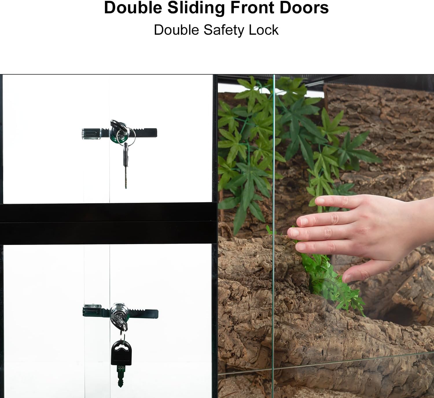 - ăDouble Front Sliding DoorăAdopt new patent design to be top grade small animal and reptile terrarium. In order to manage the tall reptile tank more conveniently, this bearded dragon terrarium has two upper and lower sliding doors. It's easy to clean the tank or add decoration. Safety lock prevents unwanted opening from children or pets.