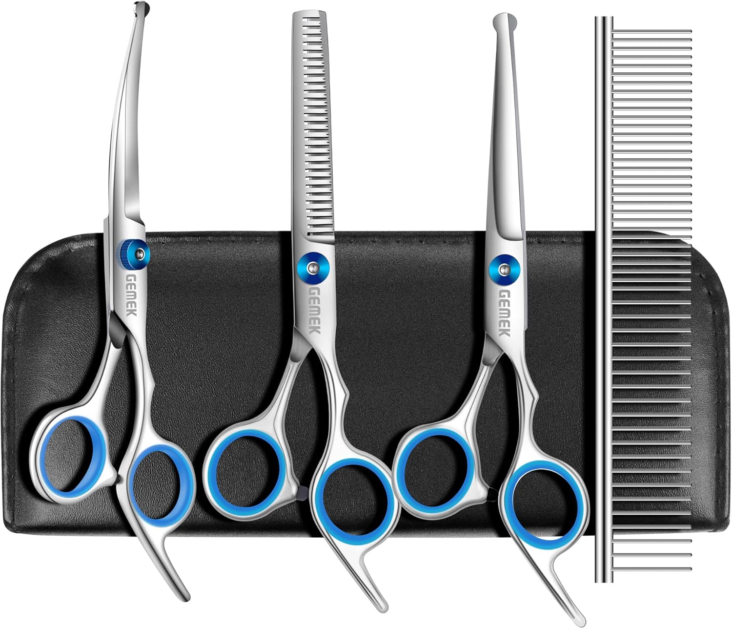 - ✔【5 in 1 Dog Grooming Scissors Set】The kit includes 1 × 6.5" straight scissors, 1 × 7" thinning scissor, 1 × 7.5" curved scissor, 1 × 7.0" grooming comb, 1 * cleaning cloth, 1 * black leather case. So it can trim any part of your pet such as body, face, nose, ear, tail, paw etc.