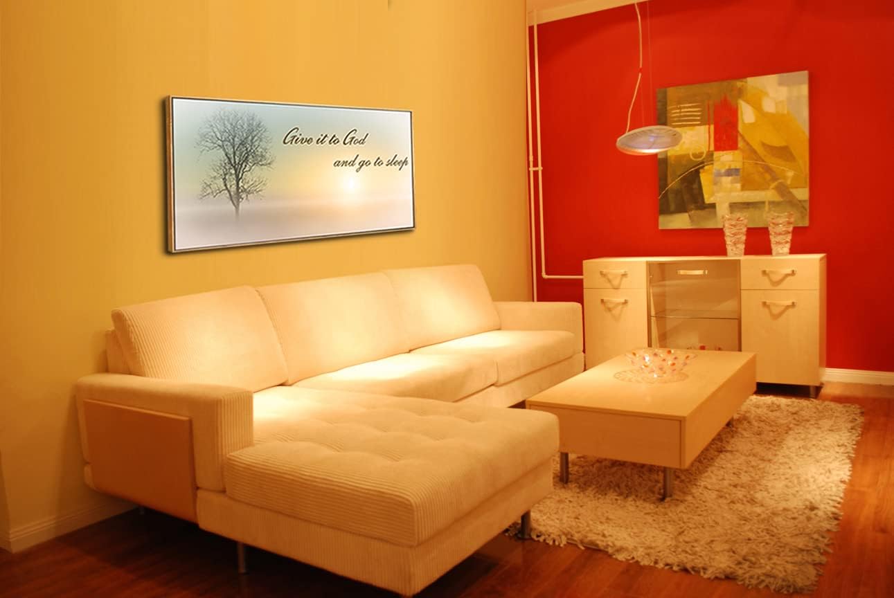 Lasdel Natural Extra Framed Wall Art of Misty Sunset & Tree Plant Picture For Bedroom Home Above Bed,Large White Country Wood Sign For Bathroom,Give It To God & Go to Sleep Artwork Decor,24x48