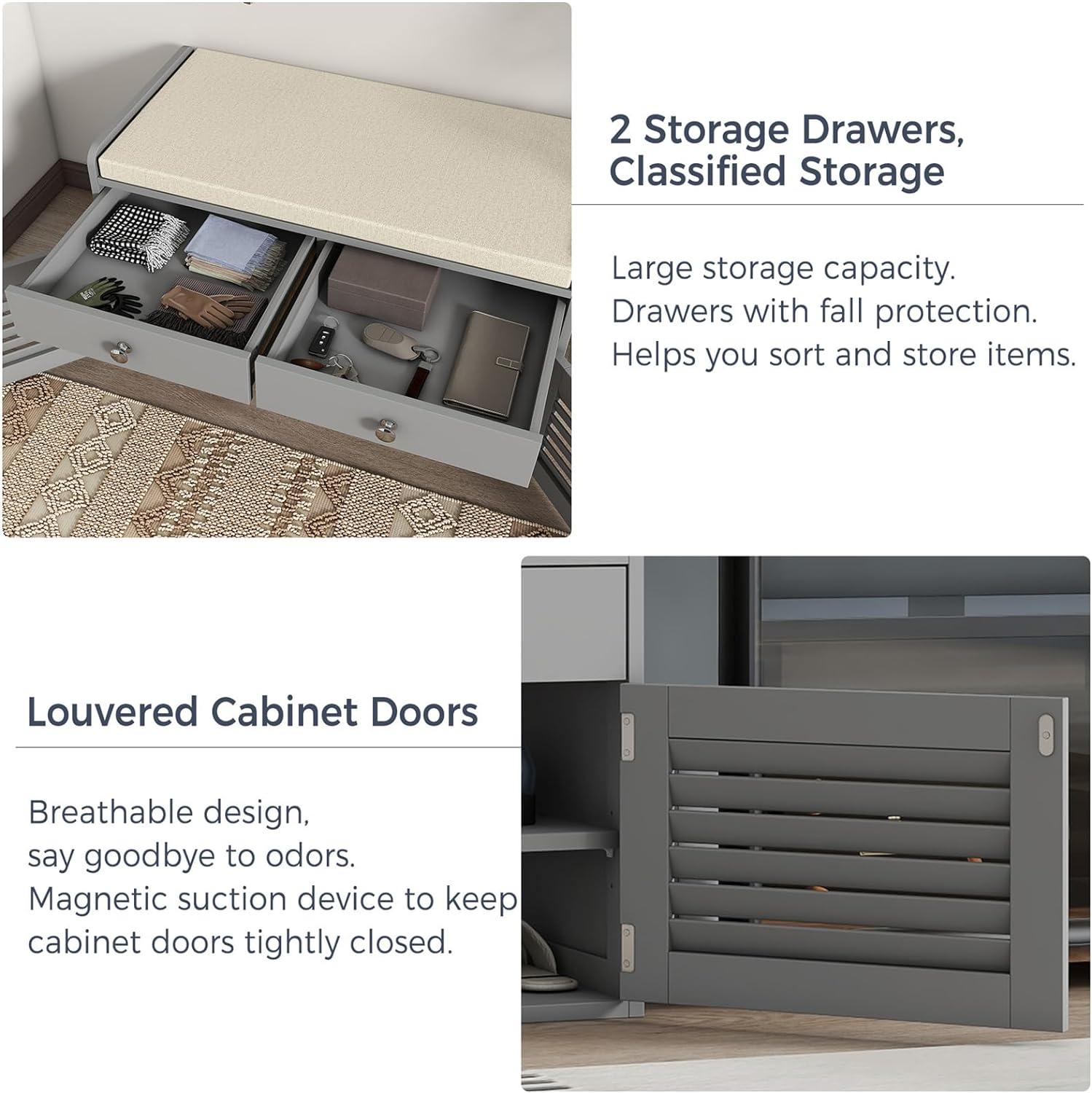 Shoe Storage Bench with 2 Drawers & 2 Doors, Entryway Bench with Cushion, 2 Adjustable Shelves, Shoe Cabinet for Entryway, Living Room, Hallway, Mudroom, Bedroom, Grey