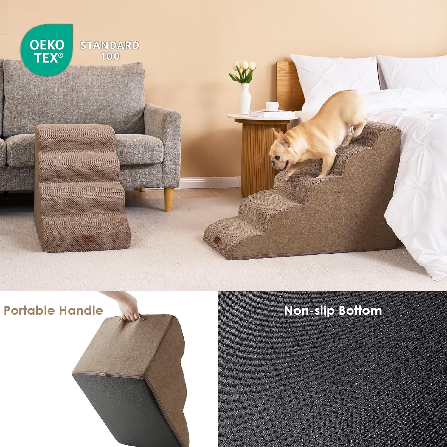 - COMFORTABLE PET STAIRS - This foam dog stair is designed directly against the edge of a bed, sofa or other furniture, so your pet can climb up and down comfortably.