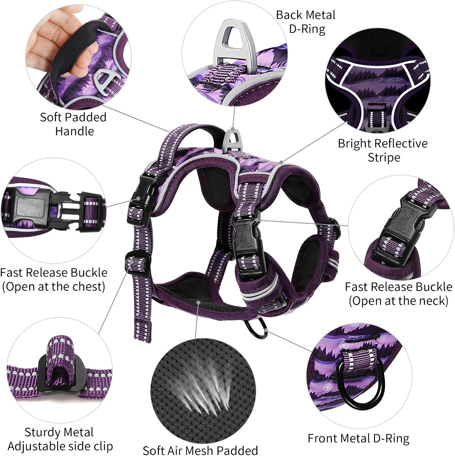 - 【MUCH SAFER & MORE COMFORTABLE】 Breathable mesh lining with soft sponge padding plate of puppy harness prevents injuries, giving extra comfort and protection with enhanced 1600D oxford fabric. The reflective material will be really nice when it gets dark. Also, your dog will be saw easily. This reflective material can make drivers have long time to react, which ensure your dog’s safety!