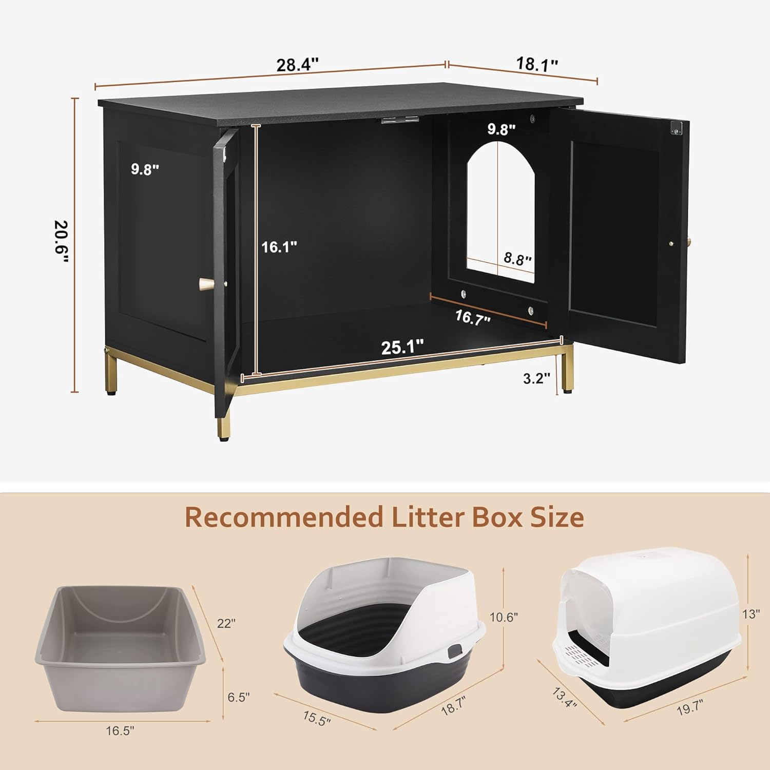 - Modern style: The cat litter box cabinet features black finish and metallic gold-colored metal frame, adding an elegant and stylish touch to your home decor. Its minimalist design and exquisite detailing inject a touch of luxury and sophistication into your living space