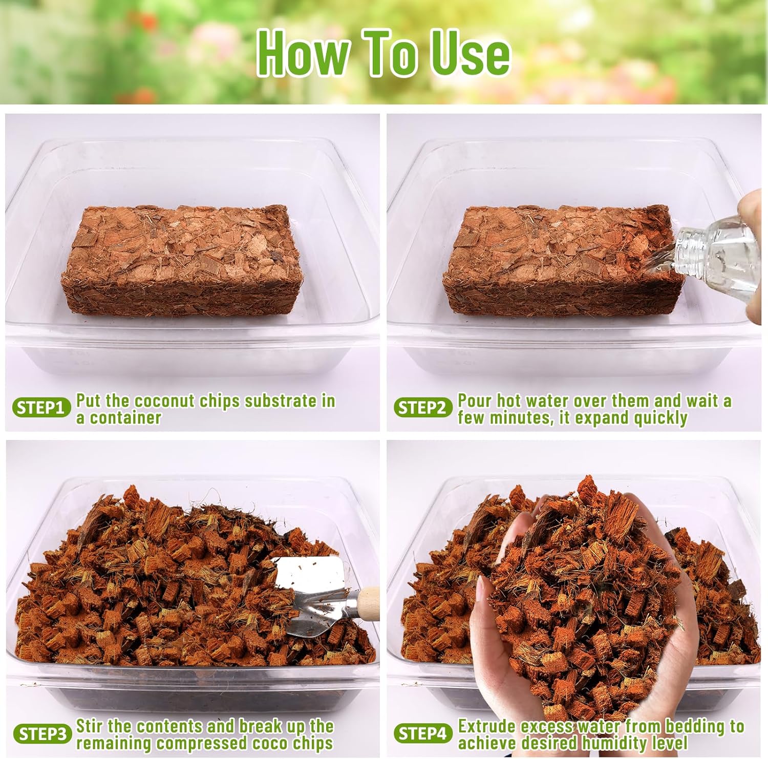 - Easy to Use and Store: Simply add water to expand and use, it can expand to several times its original size. Coconut chips are chunky, without other substances or impurities, no dust and sharp pieces, so you don't have to worry about scratching or cutting your pets skin. Compressed packages are easy to use and store. Each brick is 8.2×4.1×2.2 inch
