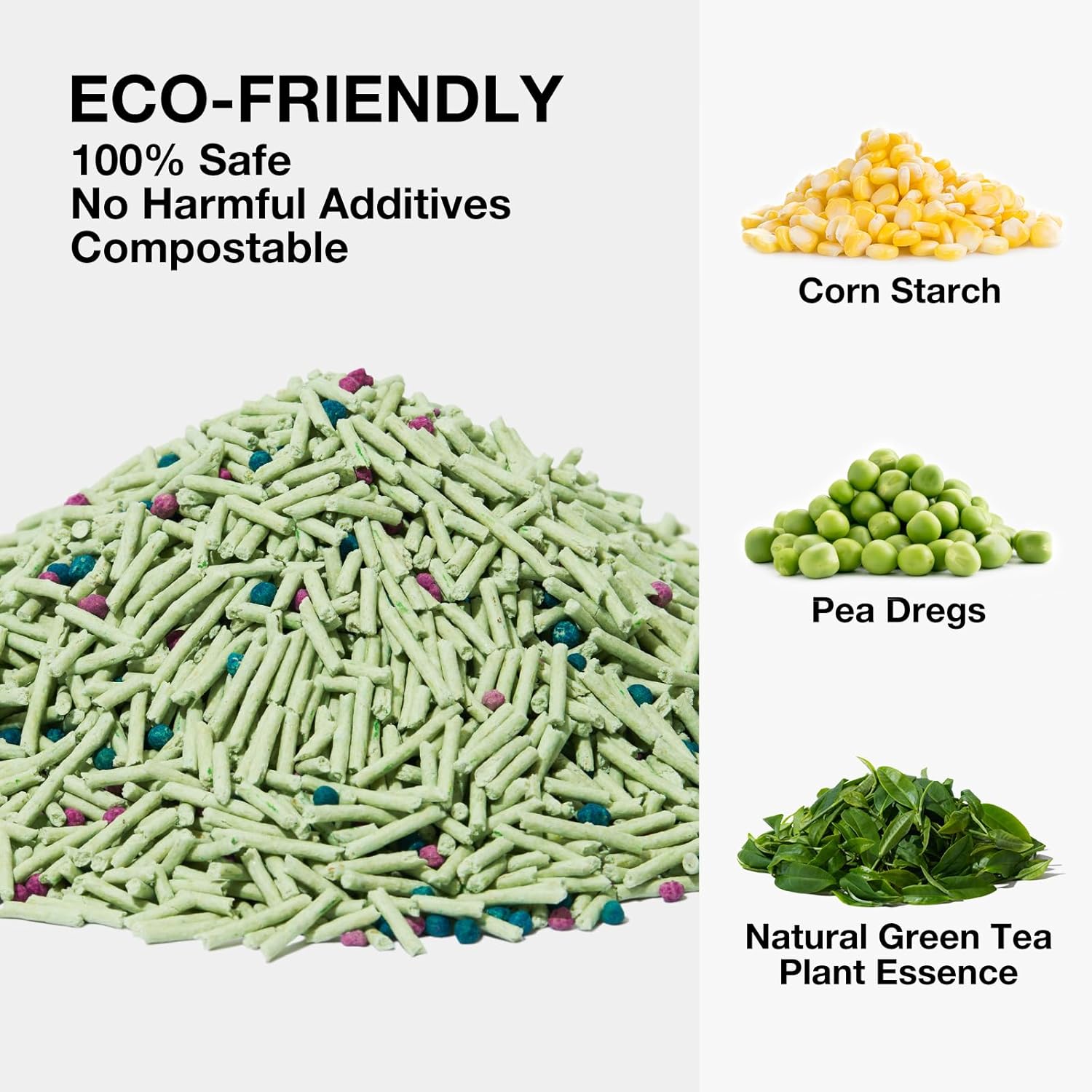 - 【Natural Plant-Based Ingredients】Our fast clumping tofu cat litter is made from all-natural peas and cornstarch, guaranteed safe ingredients.It can maximize water absorption & deodorization, anti-sticking, dust-free and always keeps air fresh