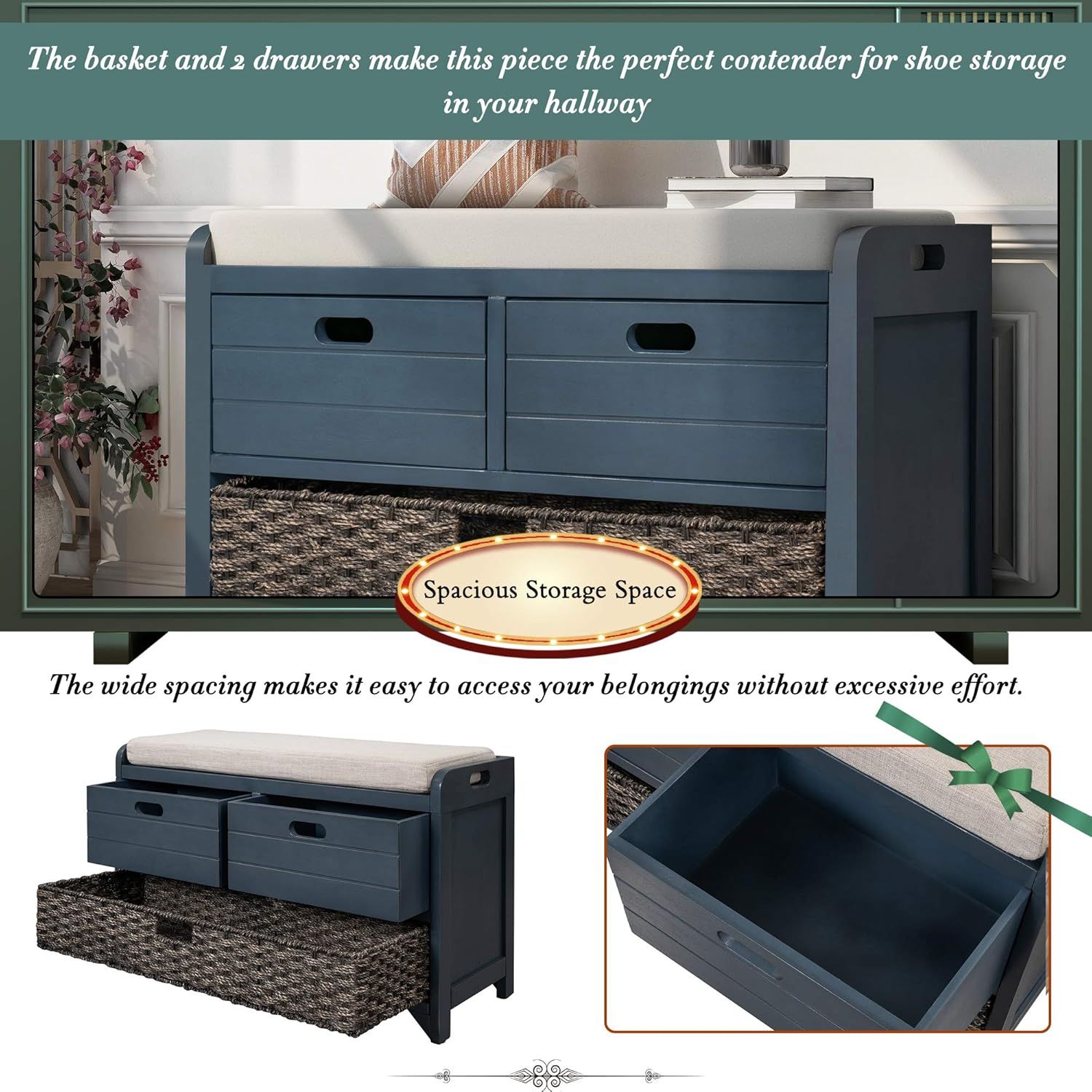 - Handsomely Crafted: Two hollow handles are designed on the both sides of the seat to provide you with convenience when moving the storage bench around. Drawers for smooth use, and the basket is removable for your different needs. This storage bench combines fashion and function, appeal to any home decor.