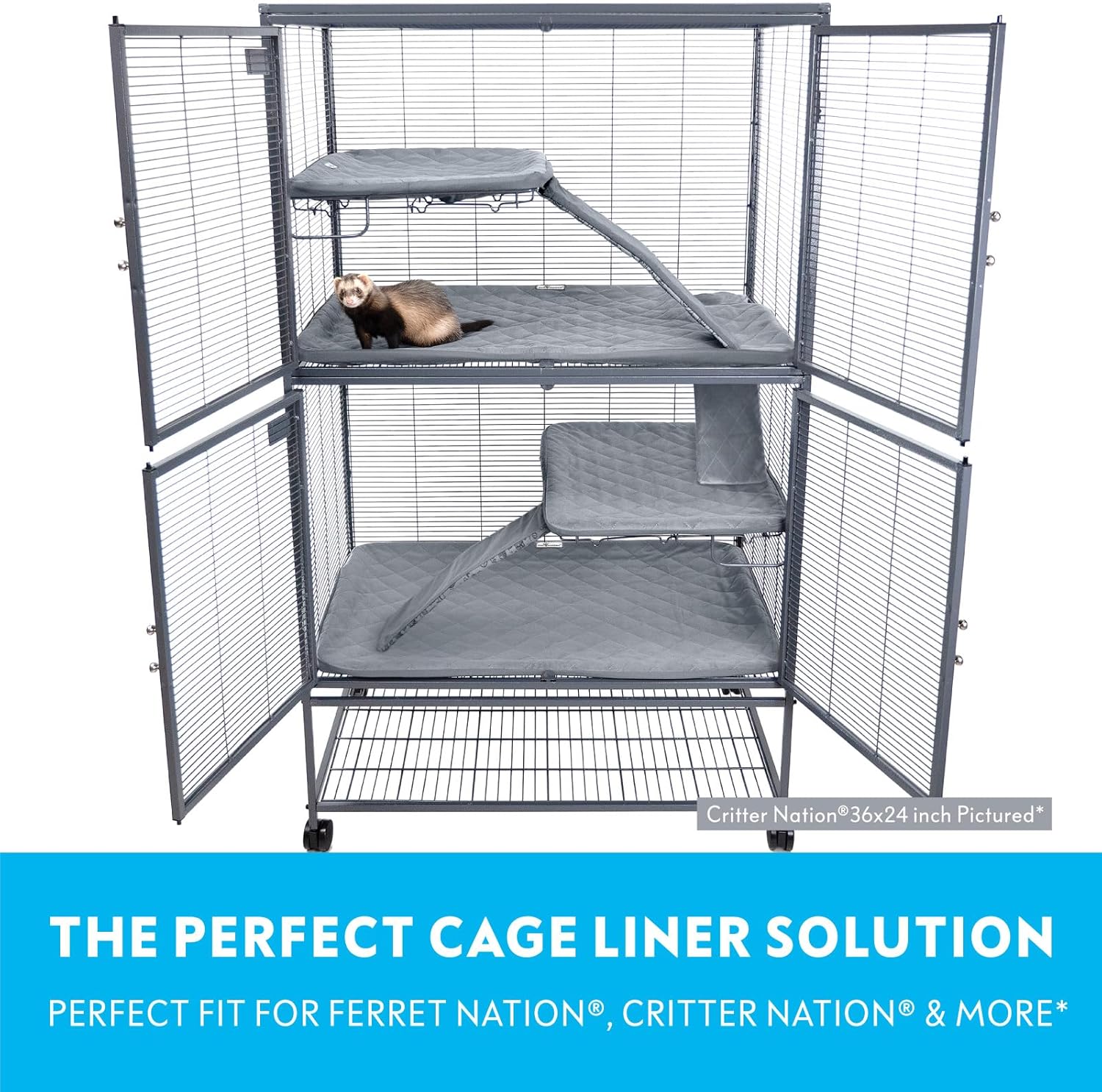 - PERFECT FIT: Designed specially for use with the Ferret Nation and Critter Nation* double unit cage. A stretchy elastic bottom makes the liner easy to put on and secure over the trays, and two flexible wide straps reinforce the liner for a perfectly tight fit. The top pan includes a cut-out for the ramp opening. The ramp covers slide on to the ramps and are secured with a strong hook-and-loop (velcro) closure.