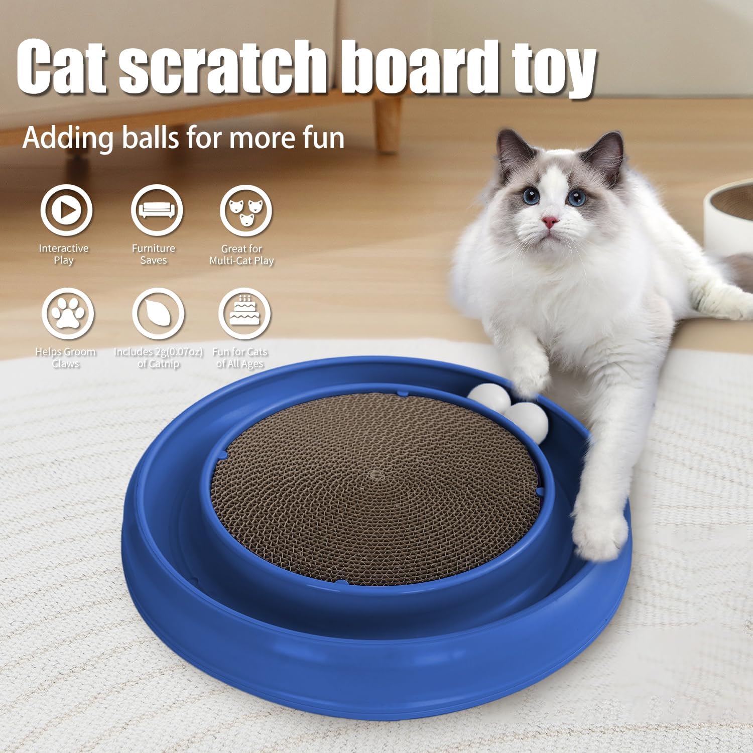 Interactive Cat Scratcher with Two Rotating Balls,Durable Scratch Pad for Indoor Play,Cardboard Cat Scratcher Pad with Cat Toy Ball Track and Catnip,2-in-1 Cat Toy (Blue)