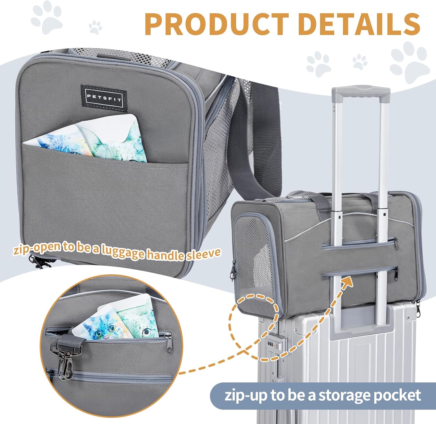 Petsfit Airline Approved Pet Carrier for Small Cats, 16.5x8.6x11 TSA Approved Carrier, with Removable Dual-Sided Padding (2-Way Placement) - Fits Under Most Airplane Seats, Escape Proof (Gray)