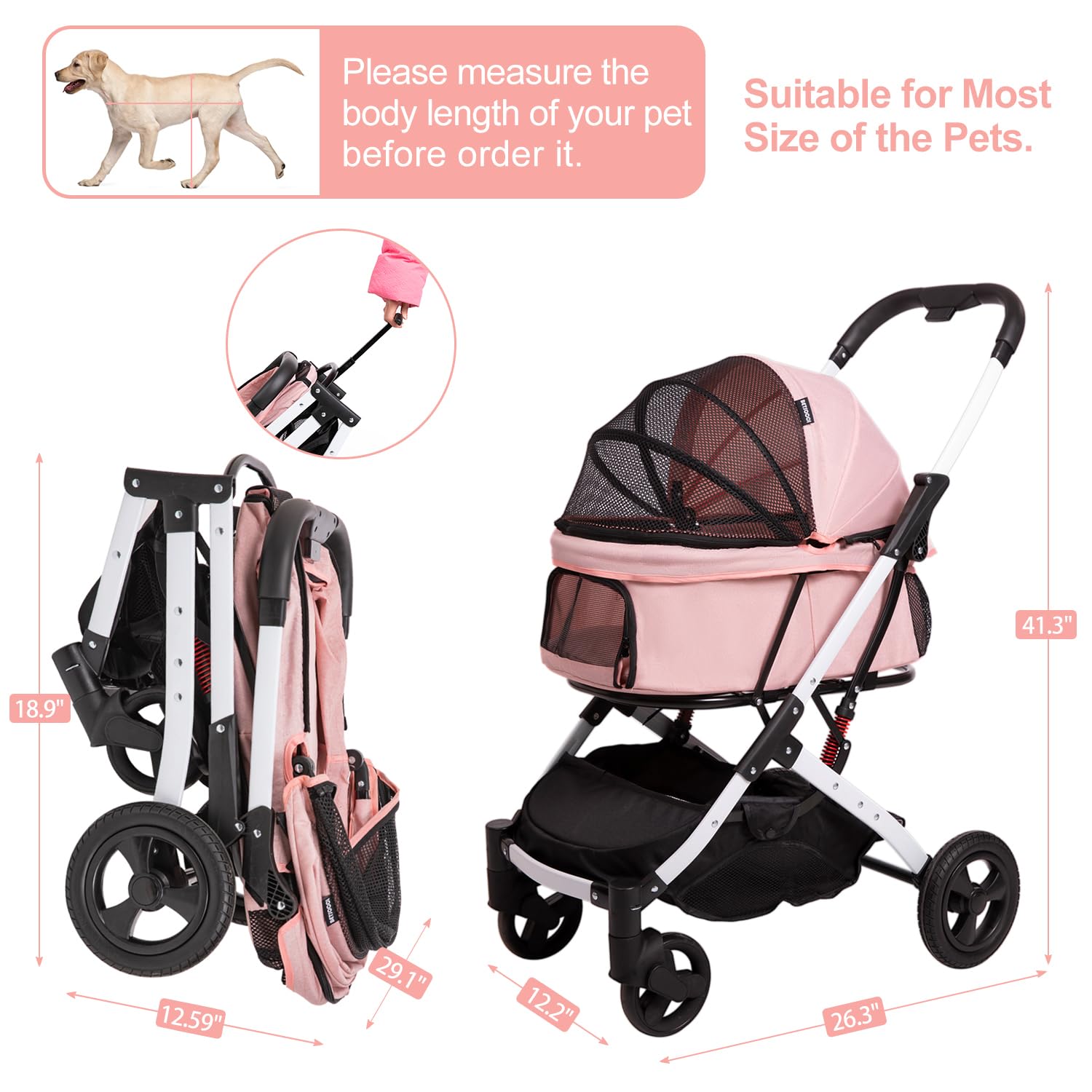 - 【Easy to Assemble & Fold】This pet stroller can be easily assembled by one person in a few minutes without any tool or skill. It can also easily fold down to a compact size with just one hand for convenient storage when not in use. Lightweight and portable design makes storage and transport a breeze.