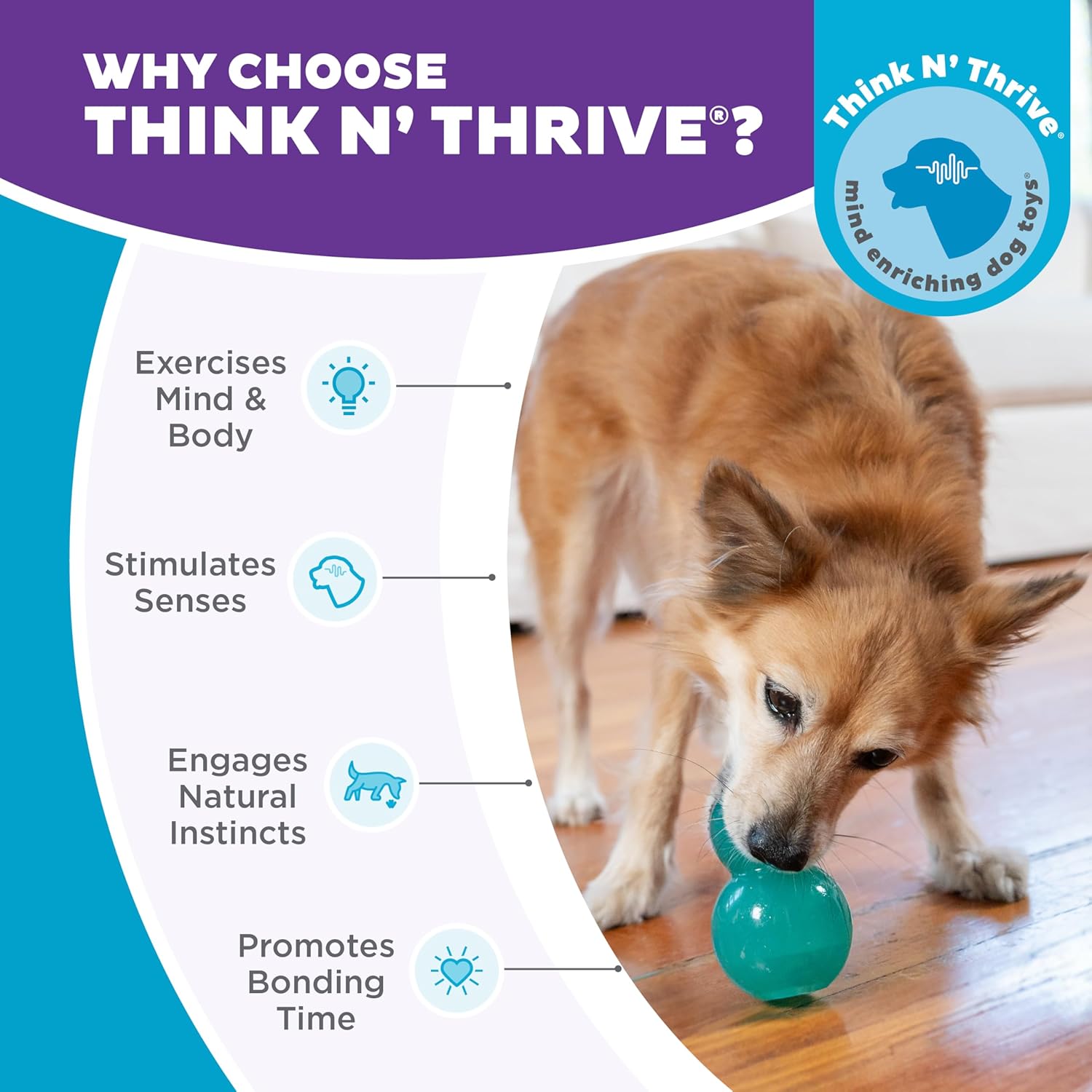 - Durable, Interactive Dog Toy & Treat Dispenser All-in-One: Helps satisfy chewing instincts when stuffed with treats; dogs can roll it, bounce it, lick, chomp, and chew to release the rewards; keeps dogs busy, including teething puppies