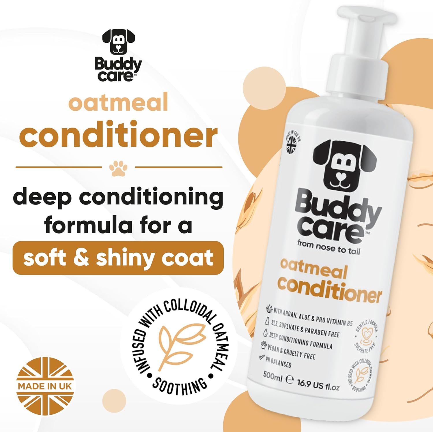- SOOTHING DOG CONDITIONER – Buddycare soothing, detangling oatmeal dog conditioner works alongside our range of dog shampoos and is the ideal final step in your pet’s grooming routine. Simply massage into your dog’s wet fur after our cleansing dog shampoo, focusing on the matted and tangled areas. Rinse thoroughly with warm water and towel dry for a clean, comforting oatmeal scent and silky-soft finish.