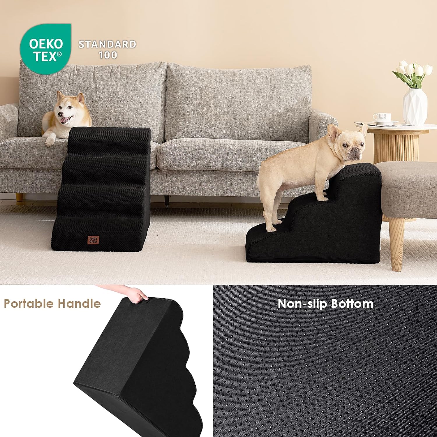 - COMFORTABLE PET STAIRS - This foam dog stair is designed directly against the edge of a bed, sofa or other furniture, so your pet can climb up and down comfortably.