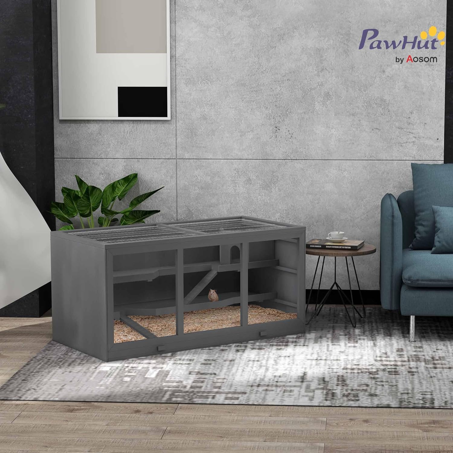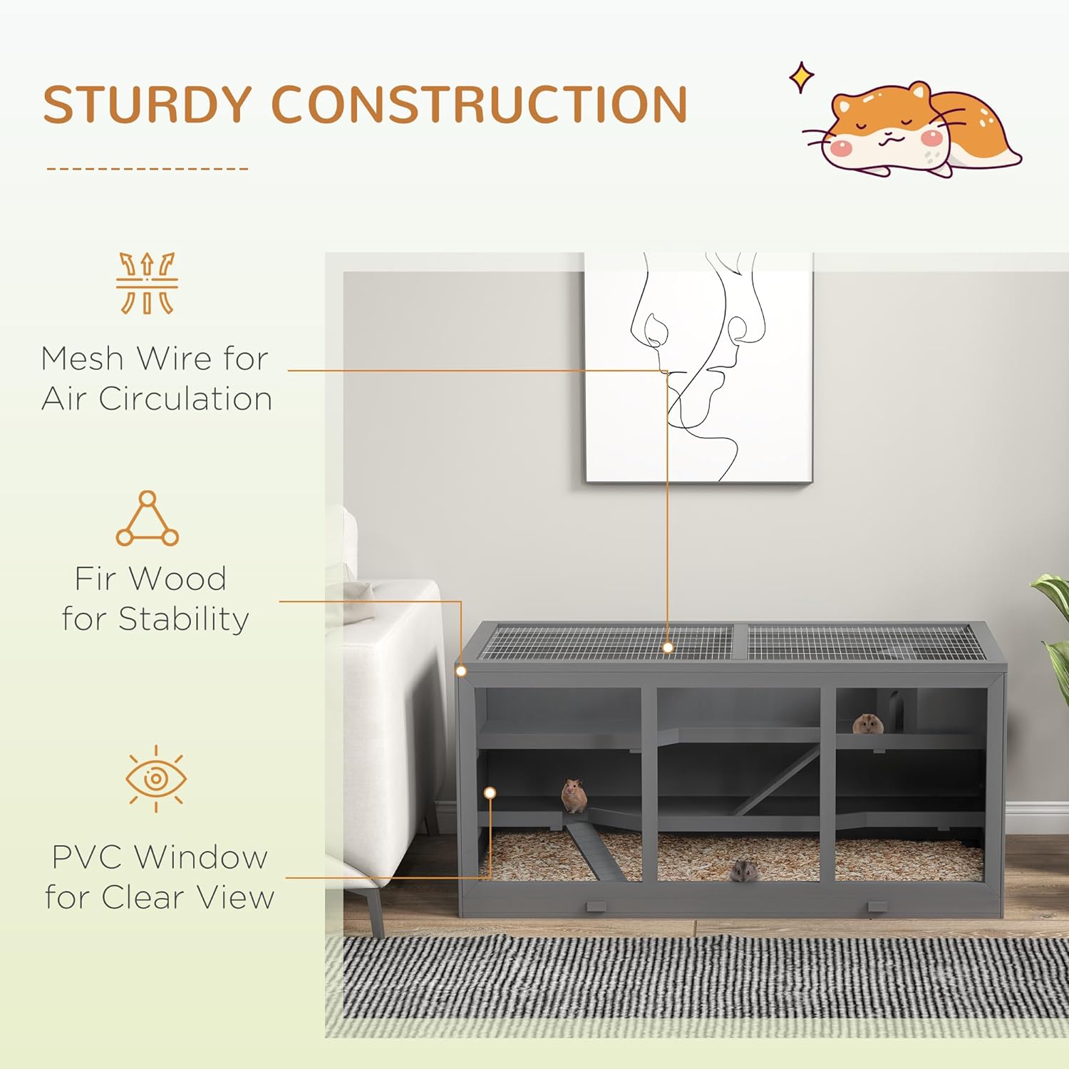 PawHut 45" Extra Large Wooden Hamster Cage, 3-Layer Chewproof Rat Cage with Opening Roof, Hut, Ramps, for Gerbil, Dwarf & Syrian Hamsters, Gray