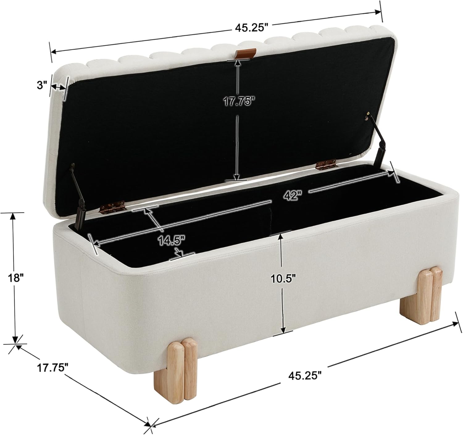 - SIZE DEMENSION AND STORAGE SPACE-Overal size:17.75"DĂ—45.25"W Ă— 18"H; Internal storage space: 14.5"DĂ—42"W Ă— 10.5"H. Not only is it an elegante furniture that can enhance aesthetics, but it is also an large additional storage space. In addition, it slows down the speed of lid closure and increases usage safety, especially when used as a storage stool for children's toys