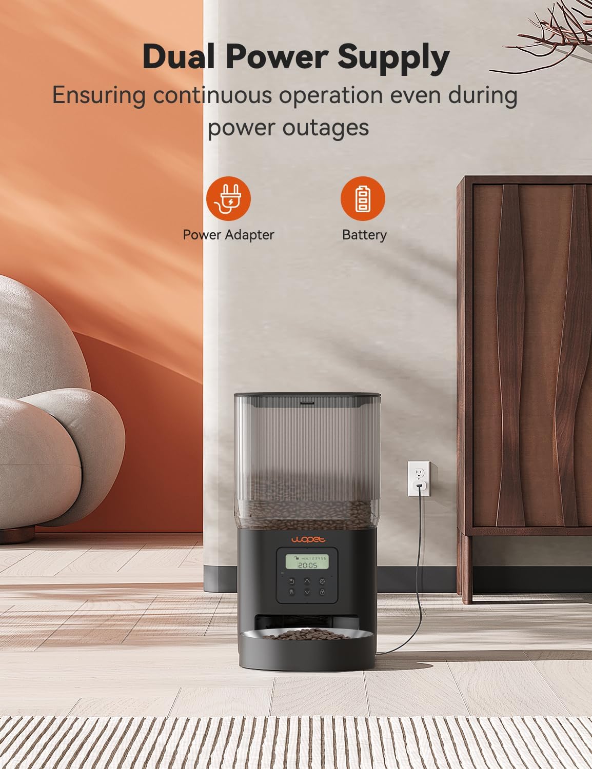 - Smart APP Control: Remotely set times to feed your pet automatically, with WOPET wifi cat feeder you can set 1-10 meals per day and up to 8 portions of dry food per meal depending on your pet's needs. Allowing you to program and monitor your pet's meals anywhere anytime through the WOPET Life App for iOS and Android phones. Compatible with 2.4G.