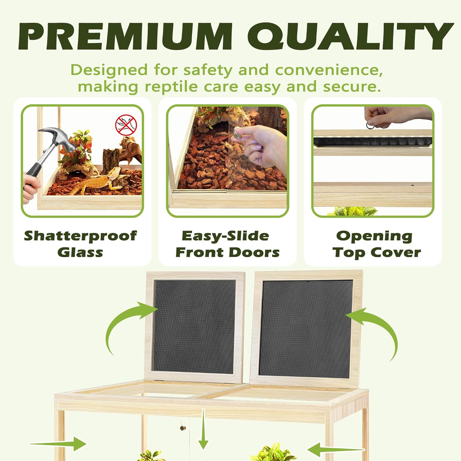 - 【Premium Wooden Reptile Habitat】Give your reptiles a safe and dependable home. Crafted from solid wood with a water-repellent polyester coating, this enclosure is built to last while maintaining a dry and stable environment. Specially designed for terrestrial reptiles (not for aquatic species), it provides a reliable space where your pet can thrive every day.