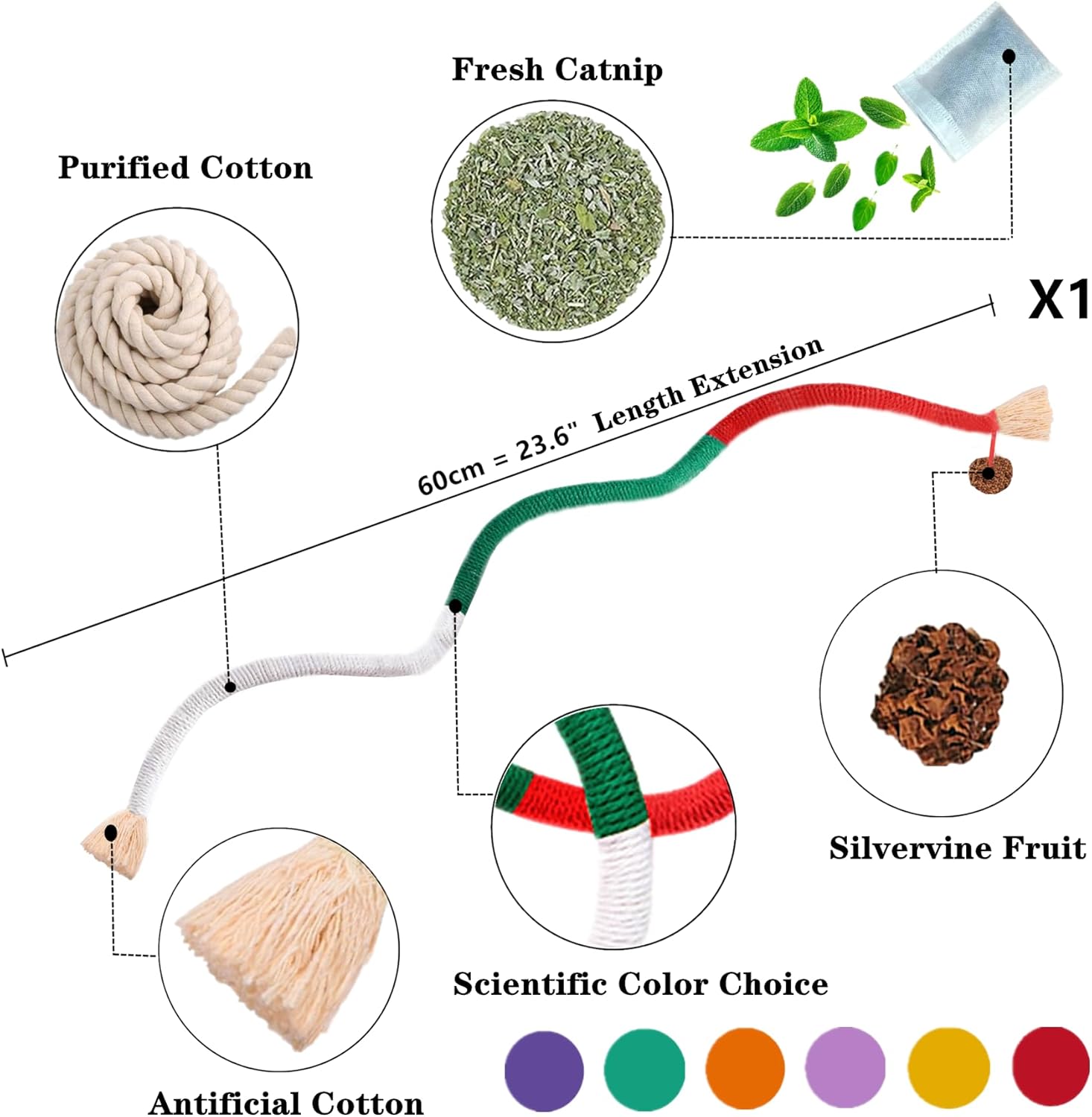 - 1. [Mix-Cat Toys for Meet all Needs]:Interactive catnip indoor toys can effectively enhance your cats' physical & mental health.package included: 1*catnip bag + 1*23.6βCat catnip rope toys + 1*cat silvervine stick with lafite grass + 1*cat silvervine stick with black feather.the cat chew toys for indoor cats is suitable for cats of all ages & breeds, fun and relaxation for every stage of life. No wire inside, safe to use