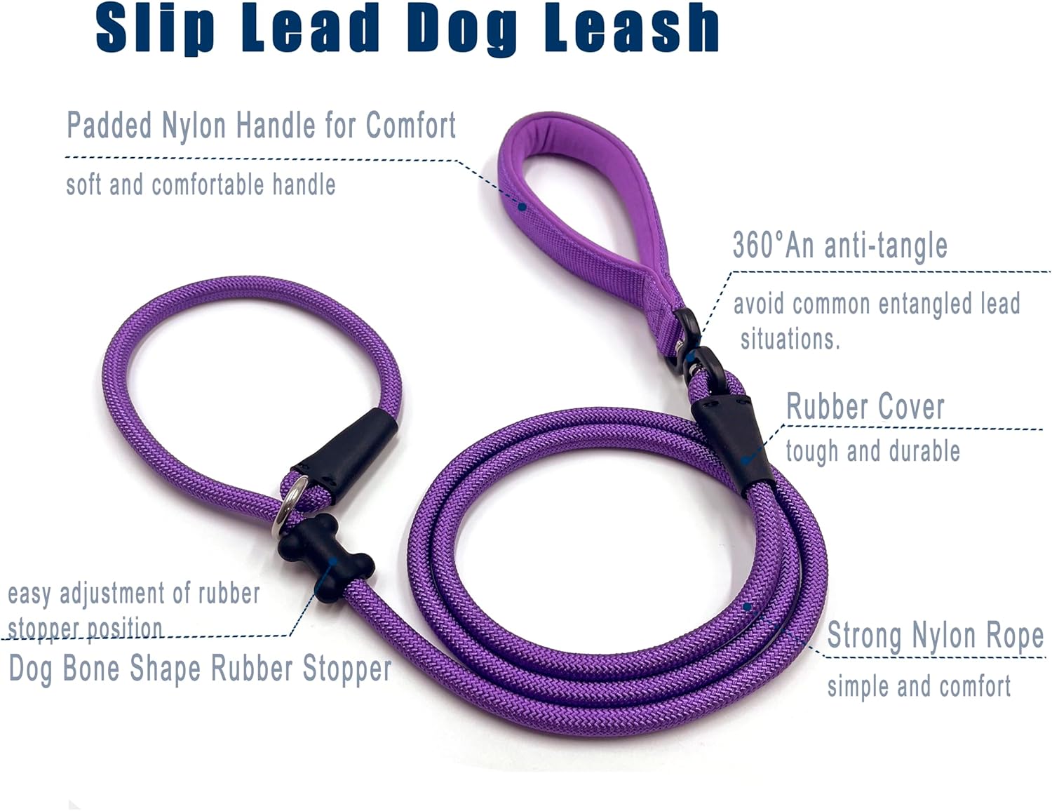 - Customized Slip Lead: An anti-tangle slip lead that is stiff enough for walking your dog, yet soft enough to move freely. When your dog moves in different directions (especially when walking multiple dogs), this lead will not tangle because it is constructed to move in line with your dog's movement, not the other way around, to avoid the very common tangling lead situation.