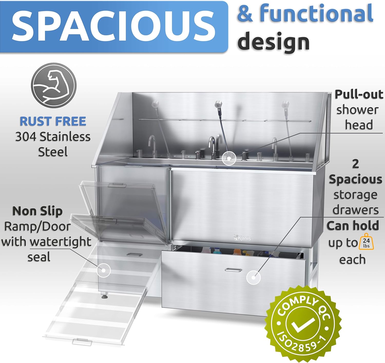 KANIS Professional Dog Washing Station - 304 Stainless Steel Pet Wash Sink & Grooming Bath Tub for Home with Ramp, Shower, Floor Grate, Storage Drawers, and Faucet for Large, Medium & Small Pets
