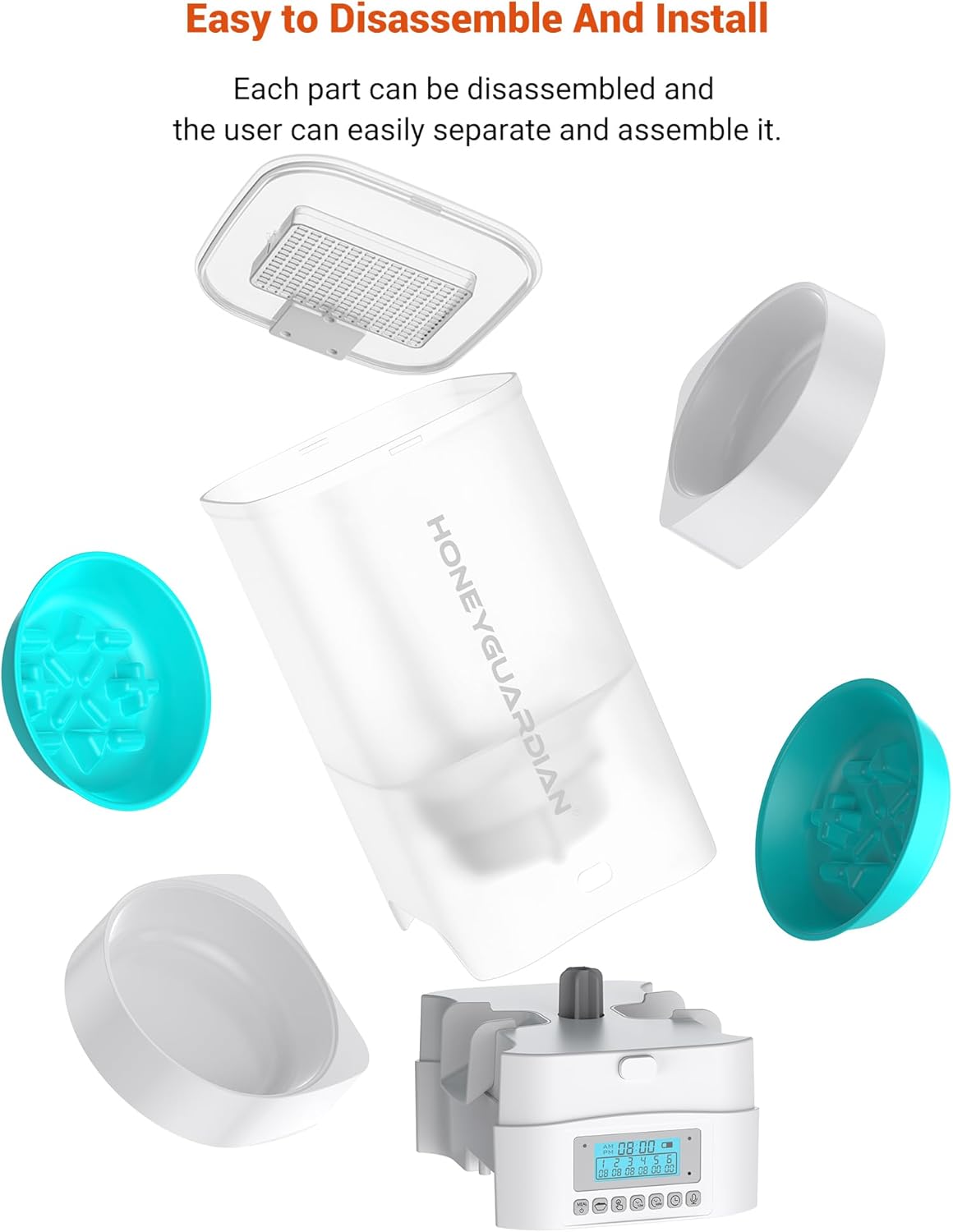 • [Easy to operate, easy to disassemble and wash] The automatic feeder is easy to set up and you can set up a feeding schedule in minutes. The top cover, clear food bucket and Slow feeder bowl can be removed from the main unit and cleaned with water. In addition to the main unit, other parts of the cat feeder should be cleaned regularly to provide a clean and healthy feeding environment for your pet.