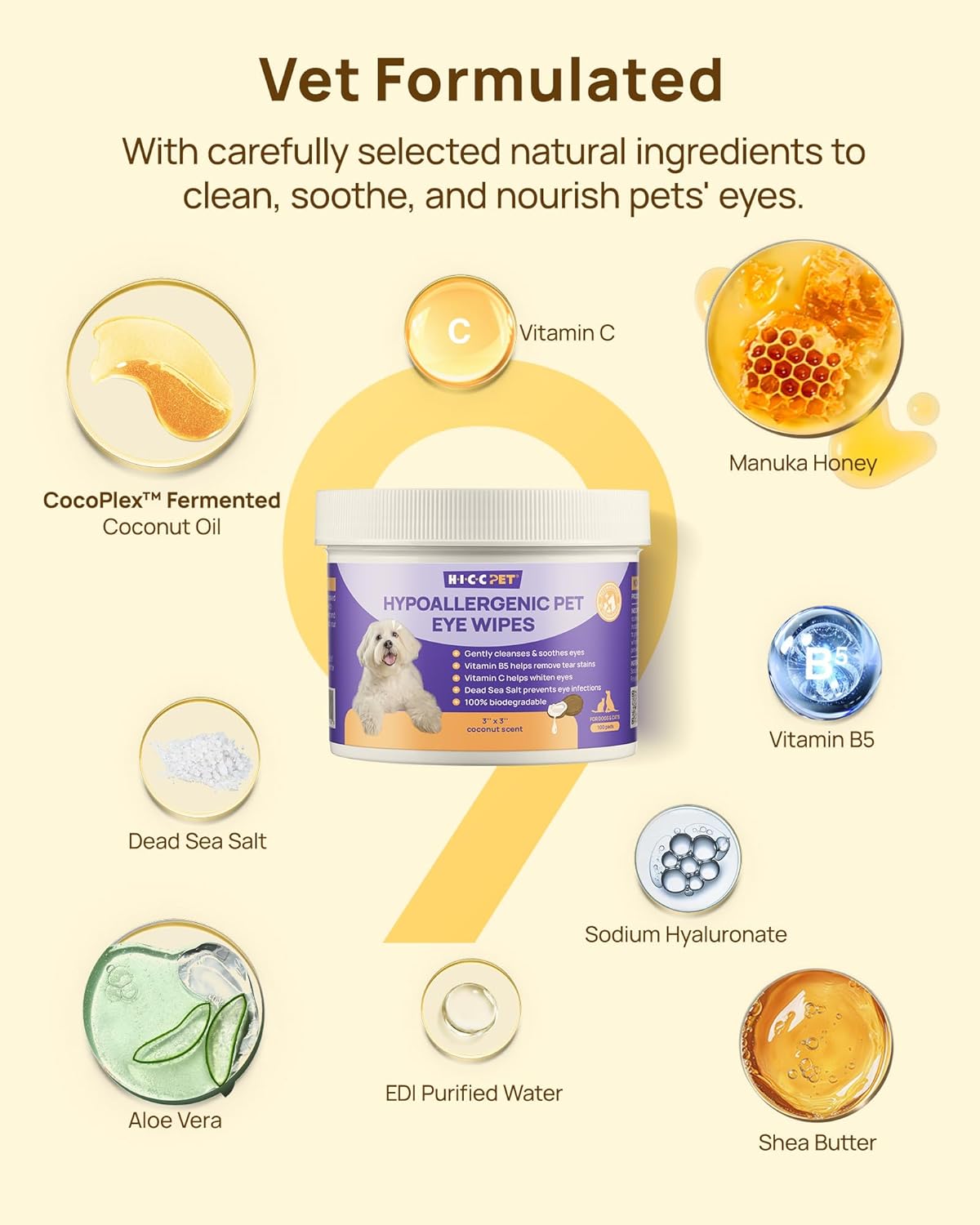 HICC PET Eyes Wipes for Dogs & Cats - Gently Remove Tear Stain, Debris, Discharge, Crust - Coconut Oil Pet Cleaning Grooming Deodorizing Wipes Wash Cleaner for Eyes, Wrinkle, Face - 100pcs