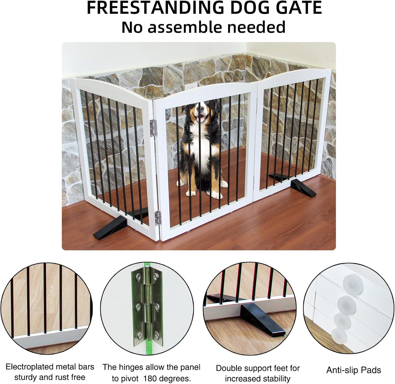 - 【Simple and Firm】 This convertible panel dog gate is a dog fence, Indoor divider, and pet pen all in one. combination of wood and electroplated steel bars . Non-Slip rubber feet to protect your floor.