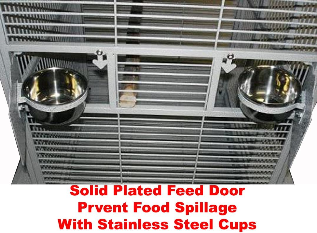 - 【Large Front Swing-Out door】(Size 12" x 34"H) with metal safety lock;【Four Stainless Steel Feeder Cups】 With Swivel Solid Metal feeder doors prevent spillage, Inside With Wooden Stand Perch. One Top Breeding Door Included.