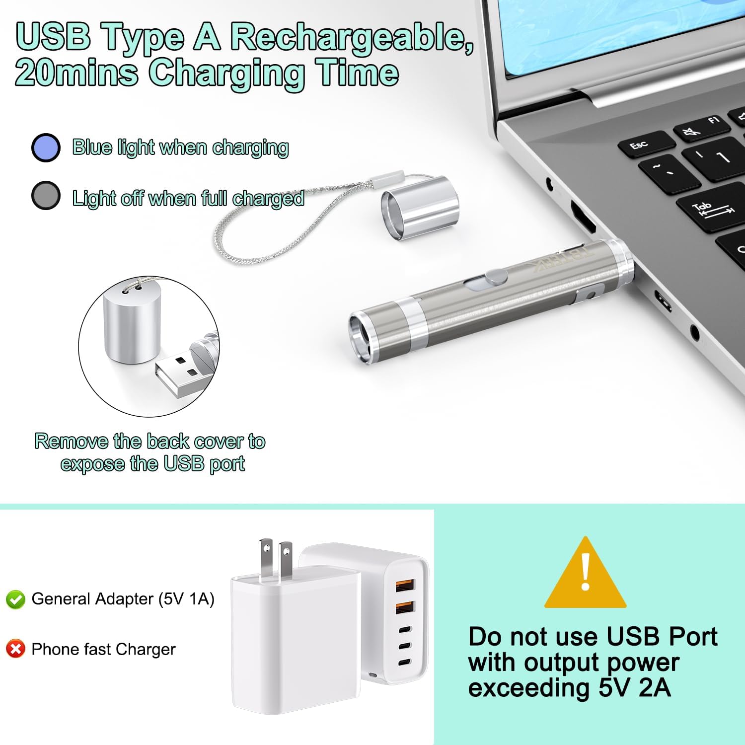 - USB Direct Charging: No dry batteries needed! Unplug the back cover and plug into USB port (adapter/computer/car) to charge, about 20mins fully charged