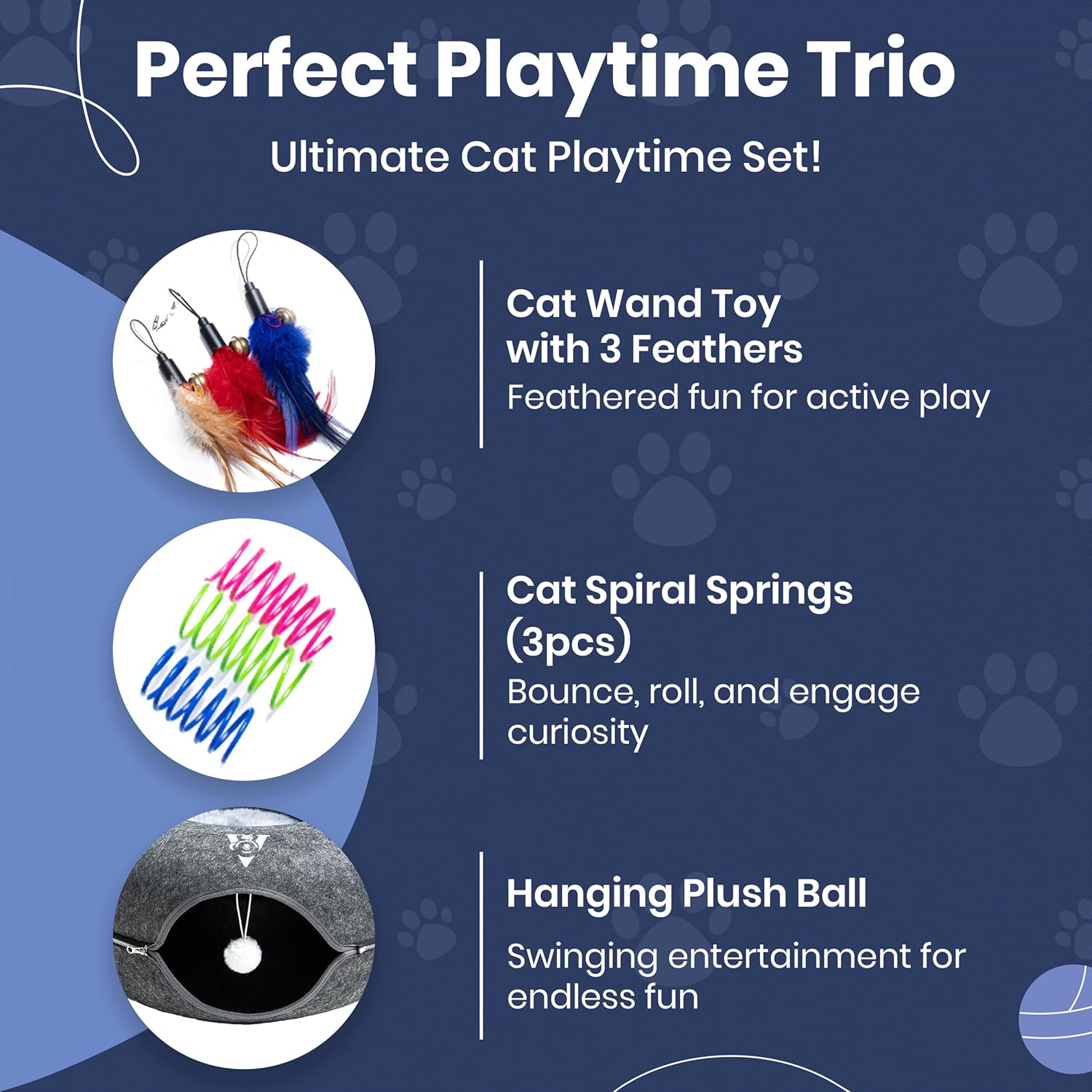 - INTERACTIVE TOYS INCLUDED - The package includes a hanging ball, a cat wand toy, and 3 cat spiral springs. The included toys and tunnel design encourage playful exploration, keeping your cat entertained and physically active. Our cat donut tunnel truly makes a perfect gift for you or your pet-lover friends