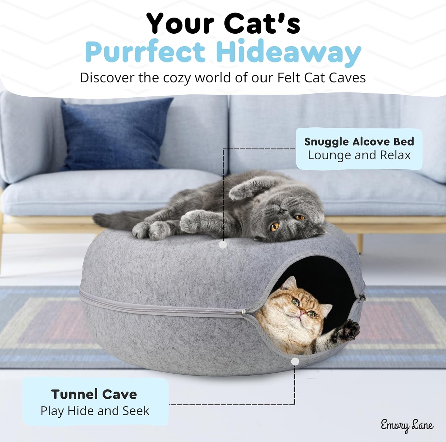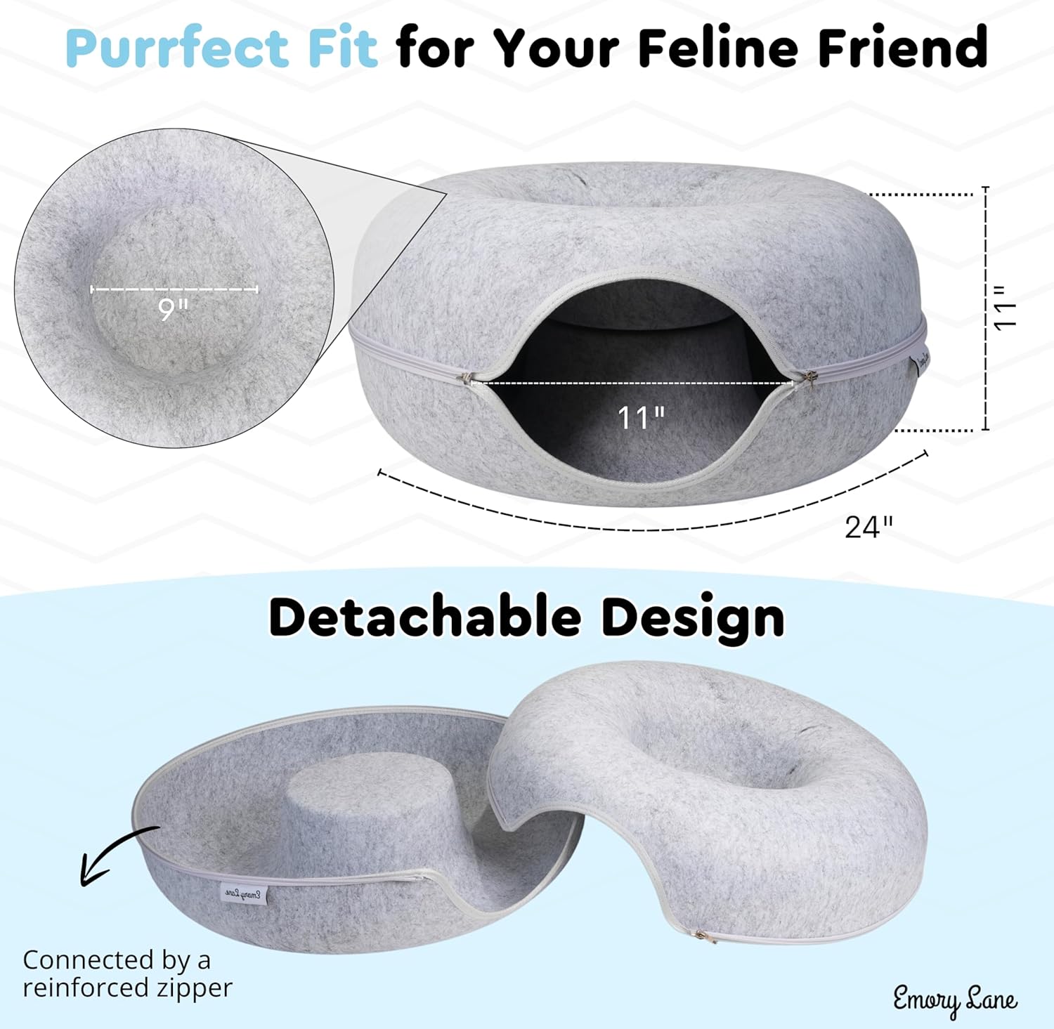 Emory Lane - Premium Cat Cave for Small Pets, Multifunctional Donut Tunnel Bed for Indoor Pets, Round Felt Pet Cave with Premium Zipper, for Pets up to 40 Lbs (24x24x11 Inch) (Light Gray)