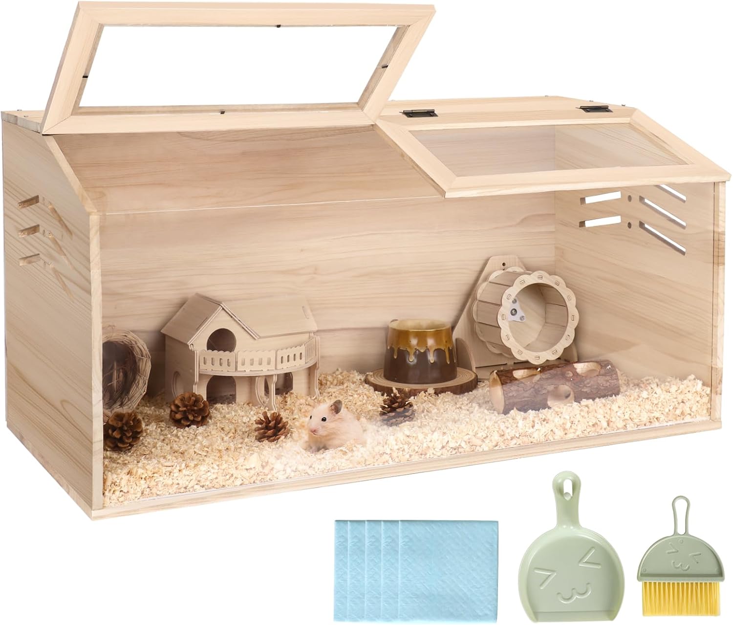 Snowtaros Wooden Hamster Cage, Large Hamster Cages and Habitats Chewproof, with 2 Openable Acrylic Top, Small Animal Cage for Mouse Gerbil Quail Dwarf Syrian Hamsters (31.5" L*15.7" W*15.7" H)
